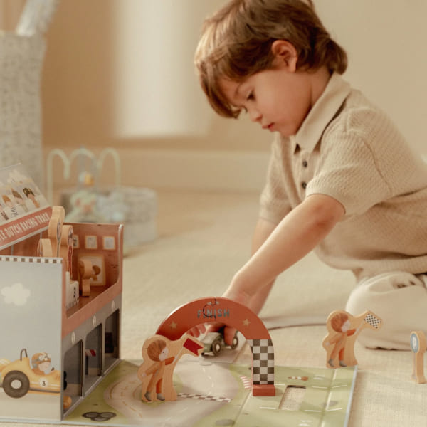 Przenośny tor wyścigowy w walizeczce od Little Dutch. Zestaw zawiera rozkładany, tekturowy tor (gruba tektura), 3 autka wyścigowe, 2 drewniane znaki drogowe, puchar, 5 drewnianych figurek oraz drewniane podium. Zestaw idealny do zabrania ze sobą w podróż, do przedszkola lub wycieczkę. Po wyścigu możesz łatwo schować wszystko z powrotem do walizki.