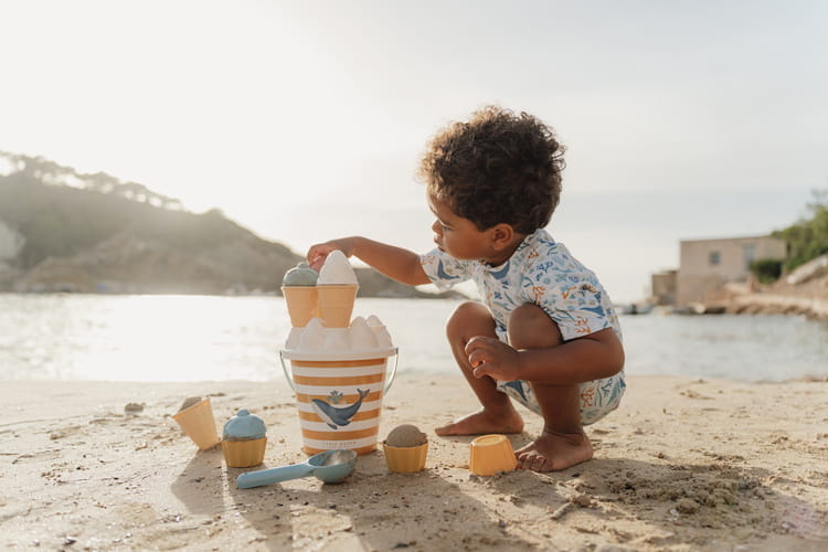 Wiaderko z lodami niebieskie Ocean Dreams od Little Dutch. Zrób najsmaczniejsze lody z piasku dzięki temu uroczemu zestawowi plażowemu. Ten 14-częściowy zestaw zabawek do piasku składa się z wiaderka i foremek w kształcie lodów, do zestawu dołączona jest również łopatka w kształcie łyżki do lodów. Wiaderko wraz z uchwytem ma średnicę 17 cm. Zestaw zawiera również sitko oraz zabawne akcesoria do serwowania piaskowych lodów w wafelku lub w miseczkach. Zestaw wykonany jest z tworzywa sztucznego i ma solidną konstrukcję na lata zabawy! Odpowiedni dla dzieci od 18 miesięcy. Zapakowany w torbę z siateczki. Stanowi doskonałe uzupełnienie dla pozostałych produktów plażowych od Little Dutch.