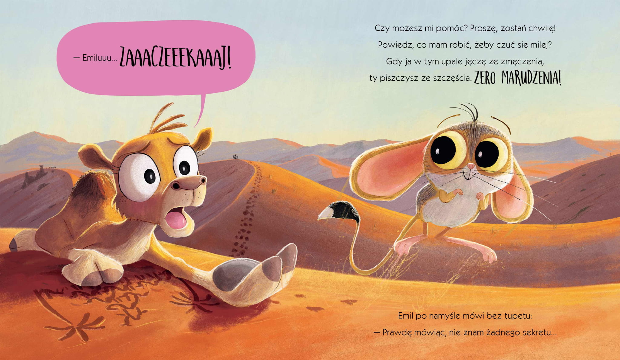 „Wielbłąd, który marudził” to kolejny picturebook autorstwa Jima Fielda i Rachel Bright (autorów m. in. bestsellerowych „Mysz, która chciała być lwem”, „Koala, który się trzymał”, „Wiewiórki, które nie chciały się dzielić”). Obok mistrzowsko przetłumaczonej przez Basię Supeł rymowanej historii główną rolę odgrywają w nim ilustracje. Niezależnie od wieku trudno oprzeć się wesołej szacie graficznej oraz pogodnej historii, która dodatkowo zostawia czytelnika z nienachalnym, a bardzo ważnym przesłaniem.