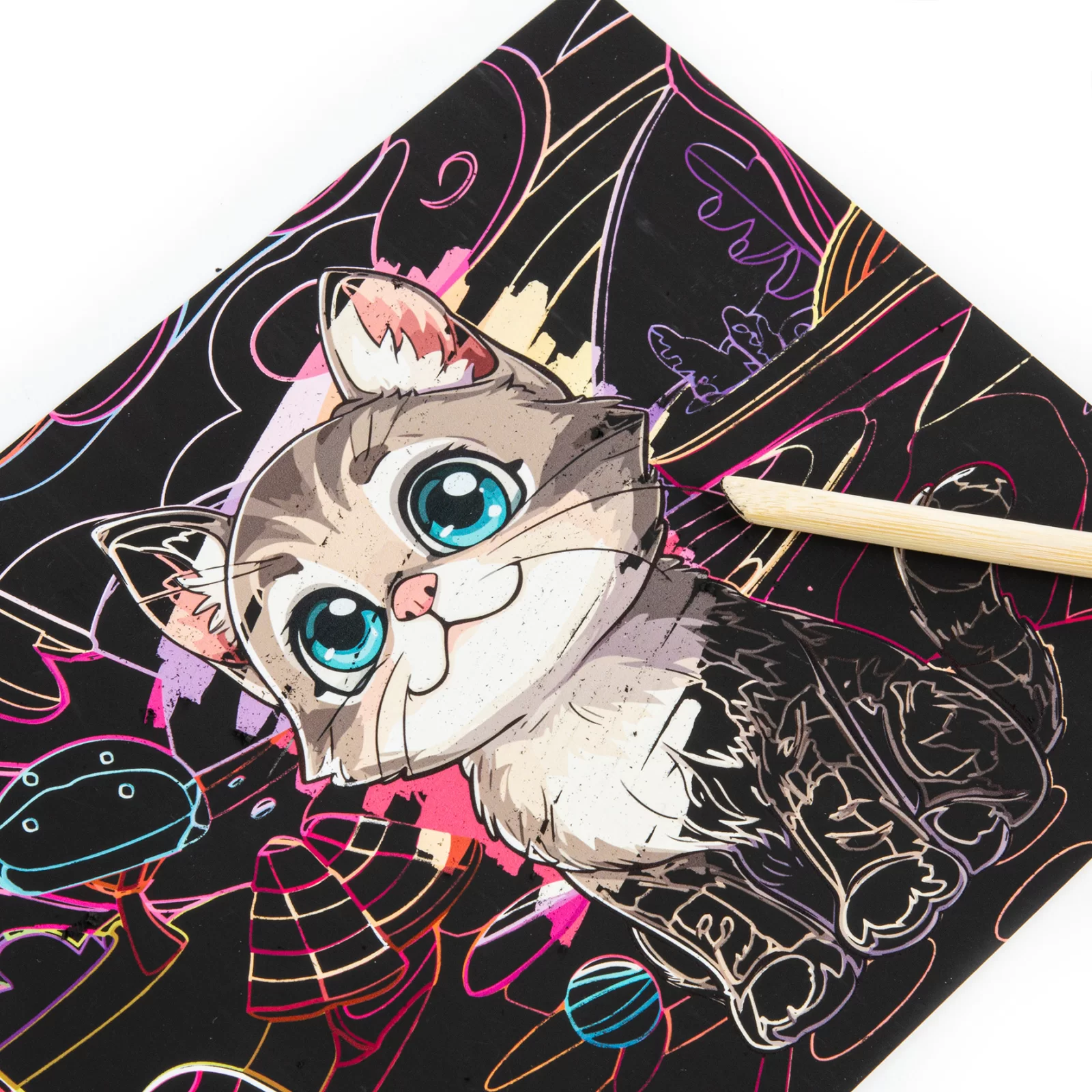 Z jednej strony arkusza znajduje się czarna warstwa, którą dziecko zdrapuje przy pomocy drewnianego rysika (w zestawie). Pod powierzchnią ukazują się urocze ilustracje kotków. Po zakończeniu wydrapywania wystarczy odwrócić kartkę i rozpocząć kolorowanie drugiej strony.