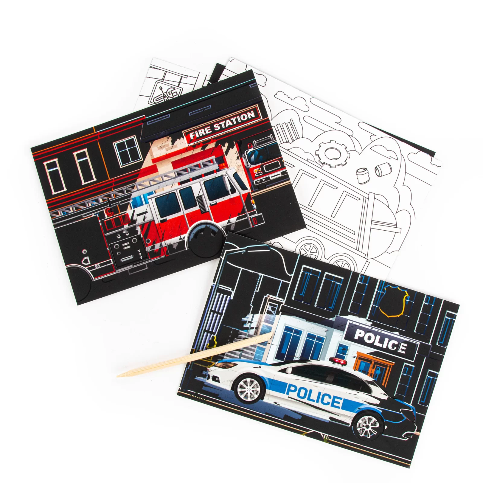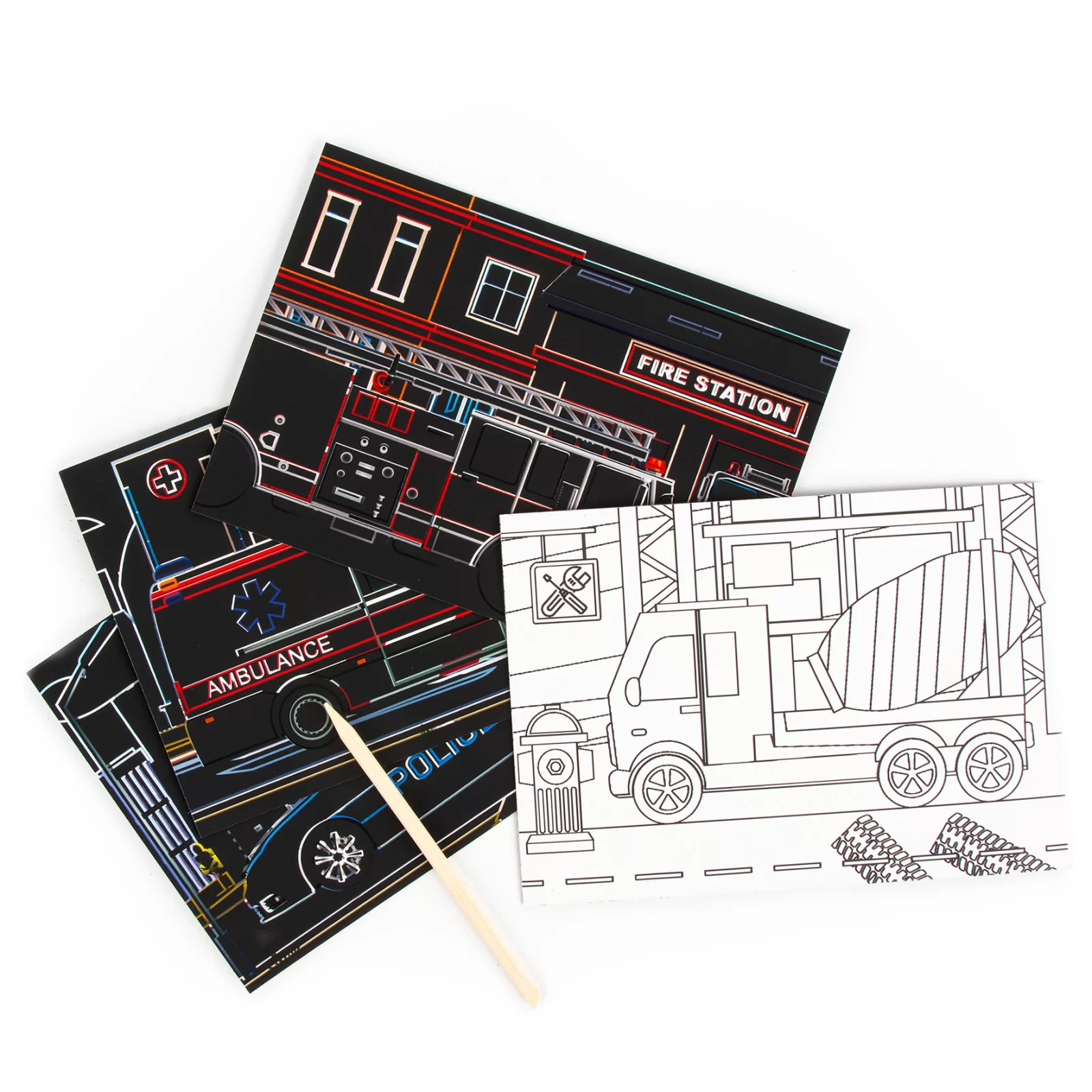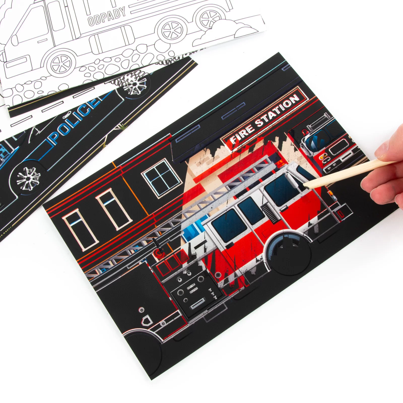Z jednej strony znajduje się specjalna czarna warstwa, którą dziecko zdrapuje za pomocą dołączonego drewnianego rysika, odkrywając pod spodem kolorowe ilustracje przedstawiające różne środki transportu. Po zakończeniu tej części zabawy wystarczy obrócić kartkę, by rozpocząć kolorowanie drugiej strony.