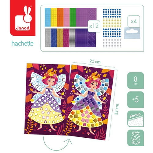 Zestaw kreatywny Mozaika Księżniczki i wróżki francuskiej marki JANOD zawiera 8 kartonowych plansz-obrazków, które przedstawiają piękne dziewczyny – skrzydlate wróżki na łonie przyrody i księżniczki w balowych sukniach. Do ilustracji tych można – zarówno w sugerowanych miejscach, jak i dowolnie – przyklejać dołączone do zestawu kryształki w 3 wielkościach i kolorach oraz drobne kwadratowe i okrągłe piankowe naklejki (w sumie ponad 1000 elementów!) w rożnych kolorach, umieszczone na 12 arkuszach, w tym 4 z efektem połysku. W komplecie znajdują się 4 samoprzylepne zawieszki. Naklejanie to dla dziecka długie godziny angażującej i jednocześnie uspokajającej, wyciszającej zabawy, a gotowe obrazki staną się wspaniałym elementem dekoracyjnym dziecięcego pokoju.