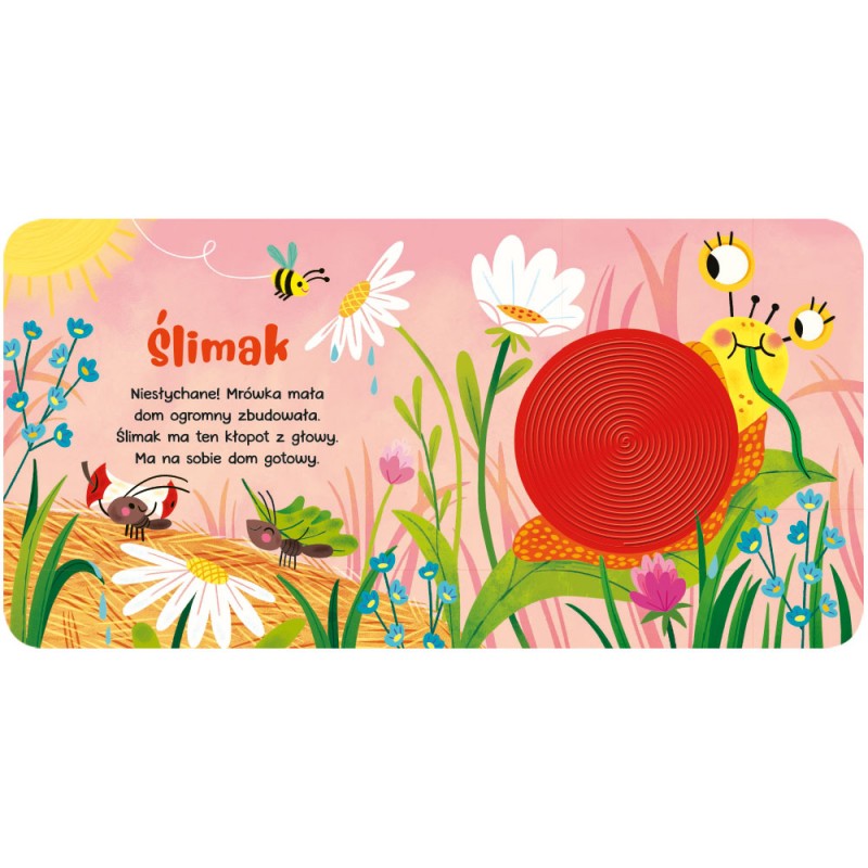 Mały królik, hopsa, hop! przy marchewce zrobił stop. Chcesz go dotknąć? Nie ma sprawy. Zapraszamy do zabawy! Zapraszamy do zabawy ze zwierzątkami. W książeczce na dziecko czekają barwne ilustracje z silikonowymi elementami, stymulującymi zmysły malucha. Wszystkie zwierzęta mają swój indywidualny wzór, dzięki czemu dotykanie każdego ze zwierzaków będzie odmiennym doświadczeniem. Silikonowe wkładki zapewniają dodatkową rozrywkę dziecku, a także stymulują prawidłowy rozwój mózgu. W książeczce znajdują się także zabawne wierszyki opisujące postacie, które w niej występują. Maluch może poznać tu małe zwierzątka: zająca, kaczkę i rybki, ślimaka i mrówki, żabę, myszkę i żuka, żółwia i kraba, pieska i wiewiórkę, między innymi ślimaka, żółwia czy żabę. Książeczka sensoryczna – doskonały sposób na stymulowanie zmysłów malucha. Przeznaczona dla dzieci w wieku od 0 do 3 lat.