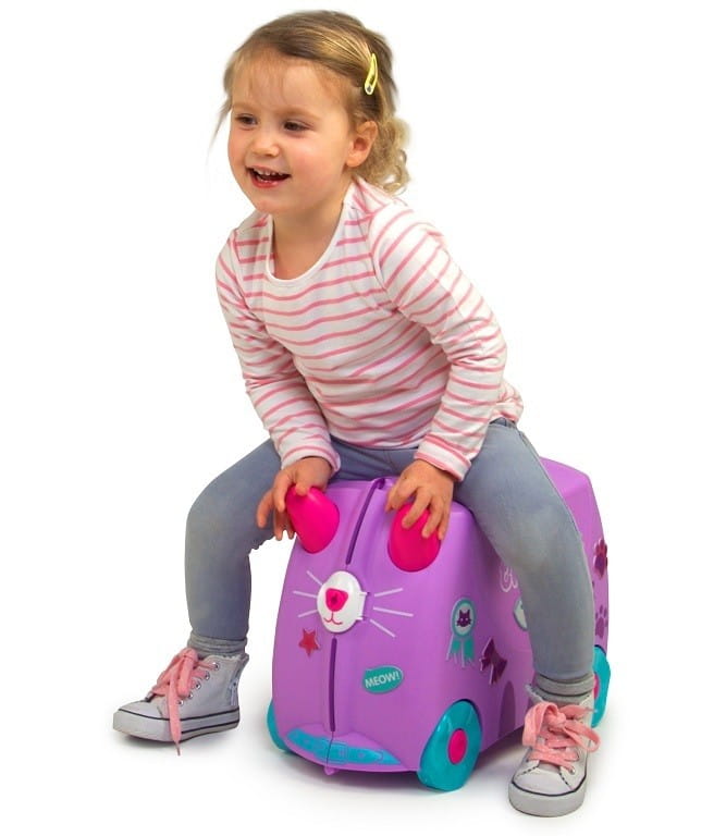 Walizka podróżna dla dzieci Trunki, z którą podróżowanie będzie łatwiejsze dla wszystkich. Jeżdżąca walizka w kształcie różowego kotka pomieści zarówno dziecięce ubranka, jak i ulubione zabawki.