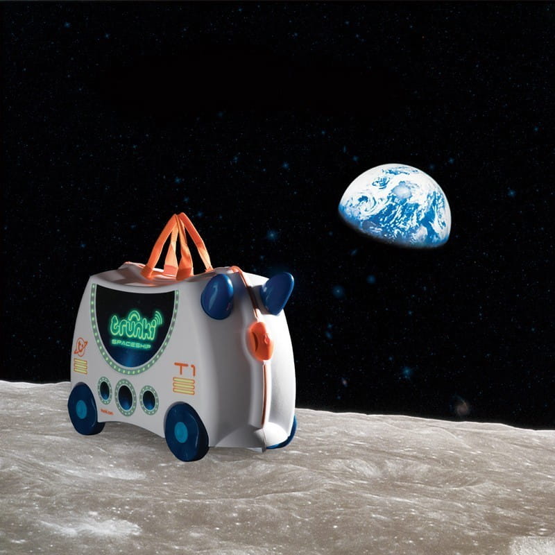 Walizka podróżna dla dzieci Trunki z naklejkami, z którą podróżowanie będzie łatwiejsze dla wszystkich. Jeżdżąca walizka w kształcie statku kosmicznego pomieści zarówno dziecięce ubranka, jak i ulubione zabawki. Jeżdżąca walizeczka Trunki - Statek kosmiczny Skye ma elementy, które świecą w ciemności.