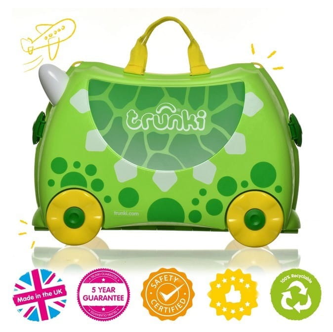 Walizeczka Trunki jest lekka, bezpieczna i wytrzymała. Spełnia wszystkie normy dotyczące samolotowego bagażu podręcznego. Dodatkowo jest bardzo pakowna (18 litrów), co umożliwia Twojemu dziecku zabranie ze sobą zabawek, gier, książeczek i dodatkowych ubranek. Posiada pasek służący do noszenia na ramieniu lub do ciągnięcia. Rogi walizeczki służą do trzymania się.