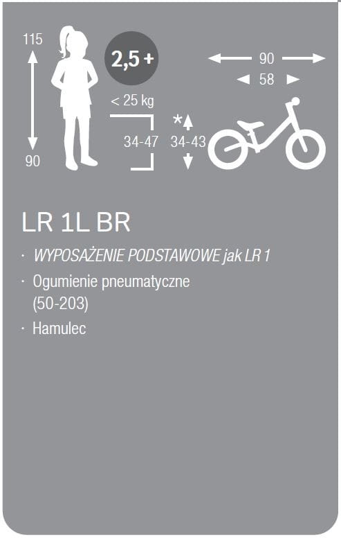 - KOŁA Z OPONAMI POMPOWANYMI 2.0" Komfort i optymalna przyczepność do nawierzchni zapewniają pompowane opony. Dodatkowo pozwalają modulować amortyzację oraz opór toczenia kół poprzez zmianę ciśnienia powietrza, w zależności od osobistych preferencji dziecka. Opony pompowane potrzebują większej dbałości niż koła piankowe, jeżeli jednak ważny jest dla Was komfort i optymalne wykorzystanie rowerka, powinniście wybrać rowerek LR 1 L!