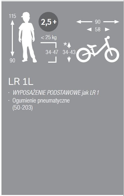 - KOŁA Z OPONAMI POMPOWANYMI 2.0" Komfort i optymalna przyczepność do nawierzchni zapewniają pompowane opony. Dodatkowo pozwalają modulować amortyzację oraz opór toczenia kół poprzez zmianę ciśnienia powietrza, w zależności od osobistych preferencji dziecka. Opony pompowane potrzebują większej dbałości niż koła piankowe, jeżeli jednak ważny jest dla Was komfort i optymalne wykorzystanie rowerka, powinniście wybrać rowerek LR 1 L!