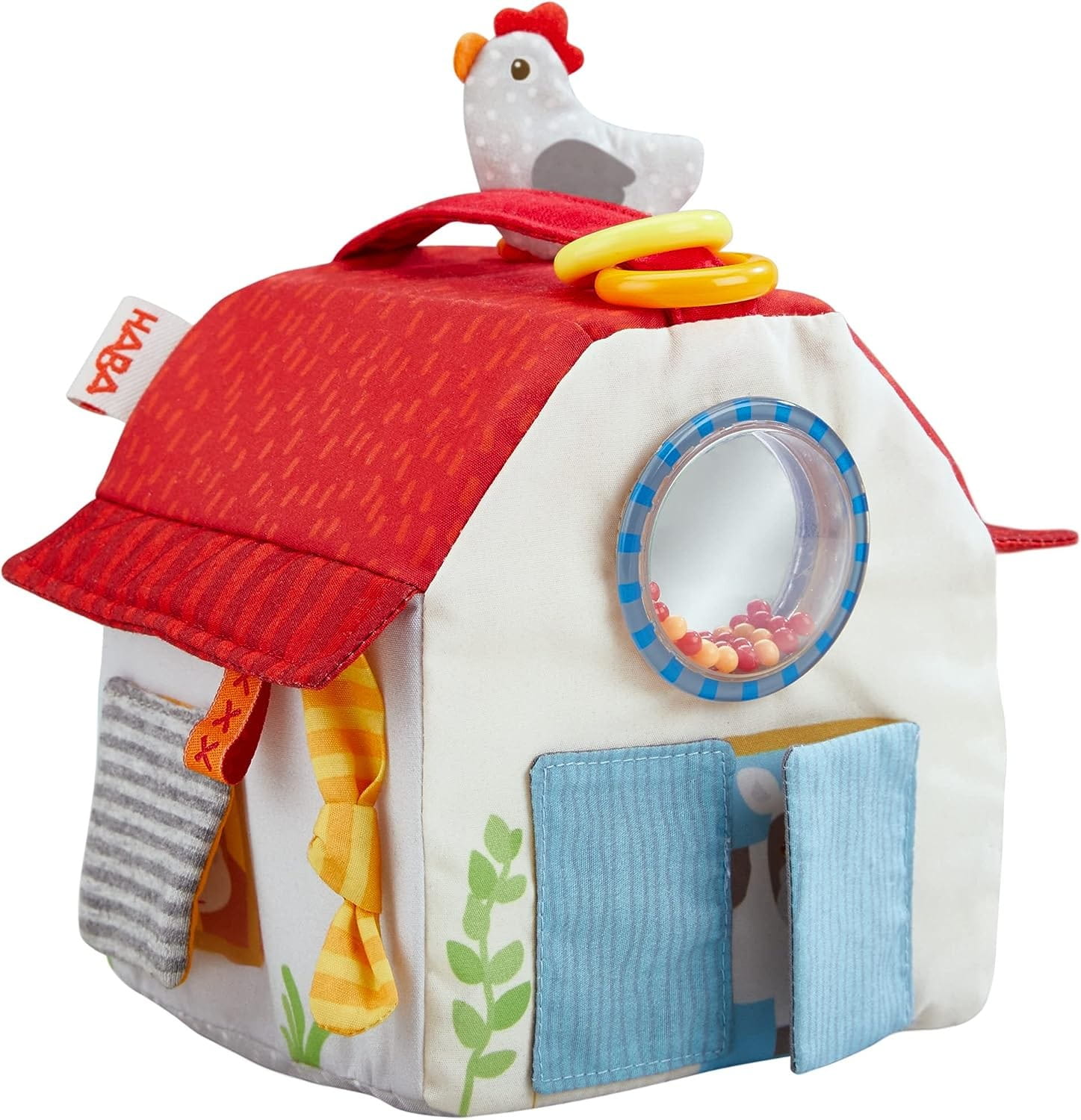 Kostka edukacyjna w kształcie Stodoły z lustrem i szeleszczącą folią, efektem grzechotki i ćwierkania jest pełna ciekawych zabaw. Miękka kostek Farma od niemieckiej marki HABA zaprasza dzieci od 6 miesiąca życia do odkrywania świata wszystkimi zmysłami.