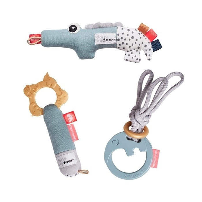 Zestaw prezentowy Done By Deer zawiera trzy grzechotki które skupiają się na wczesnych etapach rozwoju dziecka. Są one zaprojektowane w delikatnych i subtelnych kolorach z cechami, które wyzwalają ciekawość dziecka, a dzięki temu że są małe, łatwiej jest malutkim rączkom uchwycić i bawić się nimi. W tak najważniejszych miesiącach, dziecko zaczyna reagować na dźwięki, chwytać i badać rzeczy biorąc je do buzi, dotykając różnych tekstur używając do tego obu rączek.