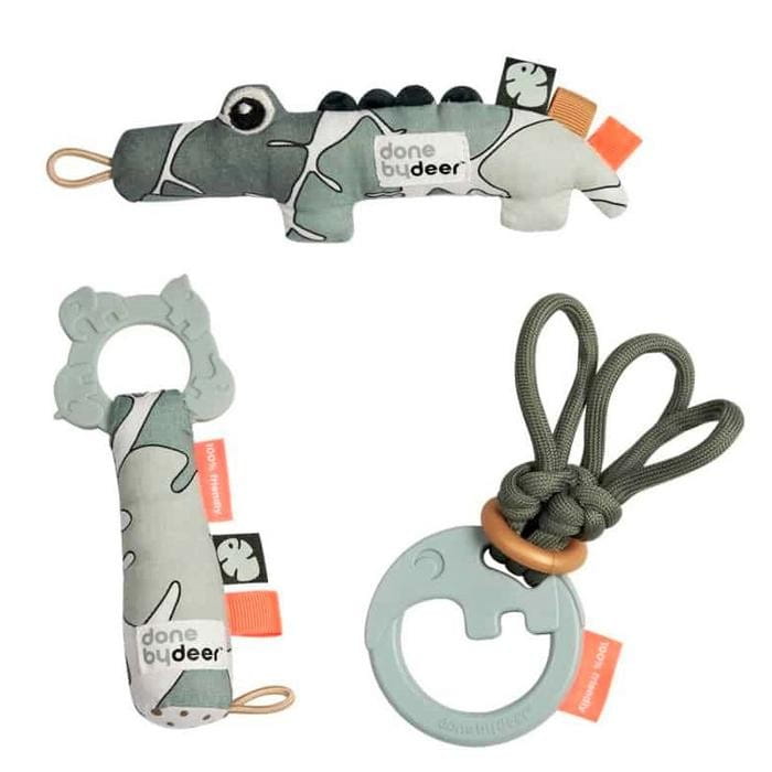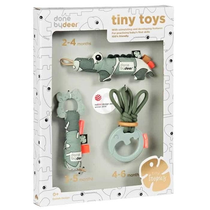 Zestaw prezentowy Done By Deer Tiny Toys Tiny Tropics zawiera trzy grzechotki które skupiają się na wczesnych etapach rozwoju dziecka. Są one zaprojektowane w nowej kolorystyce z cechami, które wyzwalają ciekawość dziecka, a dzięki temu że są małe, łatwiej jest malutkim rączkom uchwycić i bawić się nimi. W tak najważniejszych miesiącach, dziecko zaczyna reagować na dźwięki, chwytać i badać rzeczy biorąc je do buzi, dotykając różnych tekstur używając do tego obu rączek.