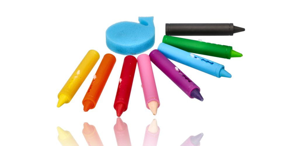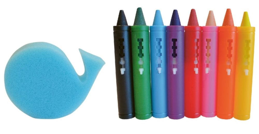 Kredki do malowania w kąpieli pozwolą tworzyć zmywalne obrazki na wannie, czy też pytkach. Kredki wysuwa się z etui, dzięki czemu nie połamią sie i starcza na dłużej. W zestawie z 8 kredkami jest też gąbka w kształcie wieloryba oraz szablony do odrysowywania. Kredki łatwo zmywają się ze śliskich powierzchni. Malowanie w kąpieli stanowi wielka atrakcje dla dzieci, umila czas w kąpieli.