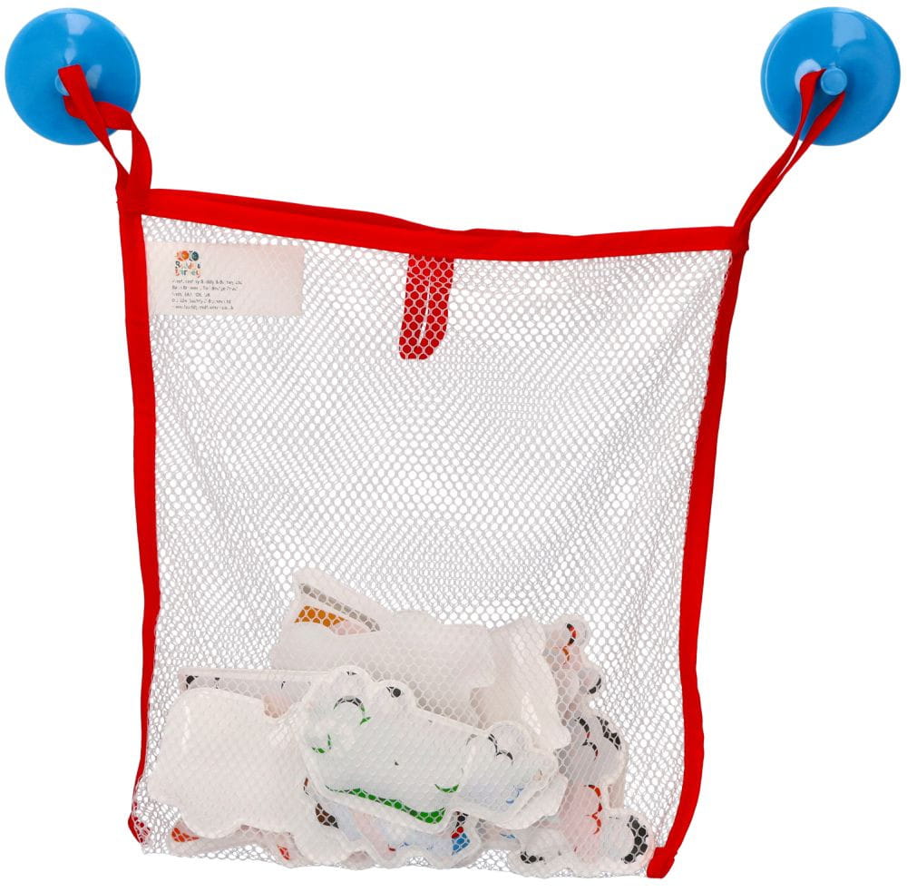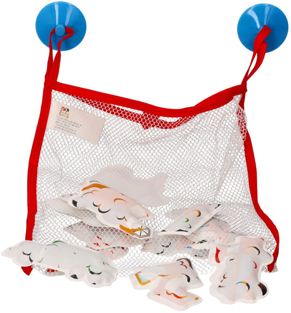 Zestaw zawiera 13 naklejek i siatkę. Siatka sprawia, że po zakończonej zabawie łatwo utrzymać zabawki w porządku. Wystarczy schować elementy do siatki i przyczepić do płytek, aby wyschły. Siatka wyposażona została w uchwyt na górze i dwie przyssawki.