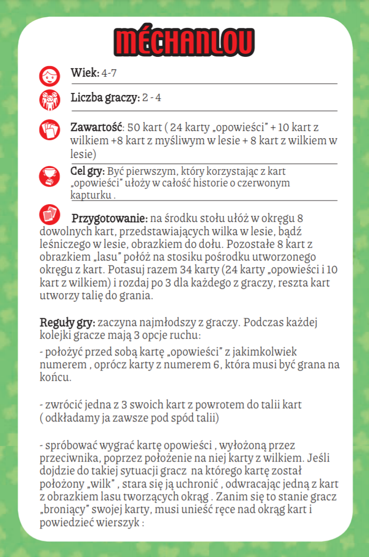 Przyjemna karcianka w sam raz do zagrania na wakacjach, czy też popołudniami z całą rodziną. Gra w karty jest oparta na historii Czerwonego Kapturka i jego wędrówce do domku babci w lesie.