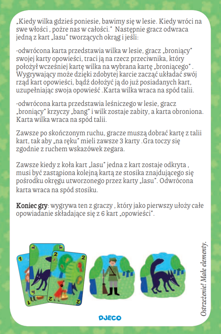- W zestawie: 50 kart (24 karty „opowieści” + 10 kart z wilkiem +8 kart z myśliwym w lesie + 8 kart z wilkiem w lesie), instrukcja