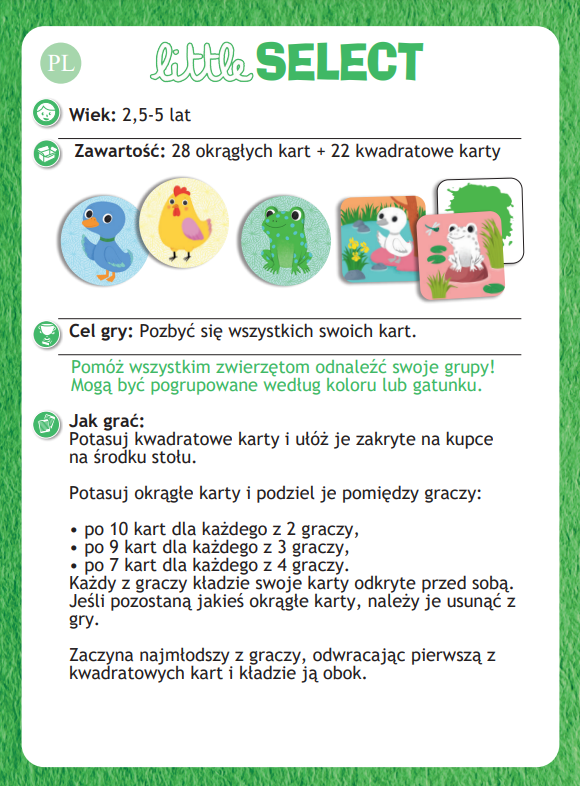 Zwierzaczki pogubiły się i potrzebują pomocy w odnalezieniu swoich kategorii. Little Select to gra karciana dla dzieci juz od 2,5 roku życia. W trakcie gry odkrywana jest kwadratowa karta, która prezentuje albo kolor albo białe zwierzątko. Jeśli na karcie jest białe zwierzątko, gracze mogą pozbyć się kart z ręki, które przedstawiają to samo zwierzątko. Jeśli na karcie znajduje się kolor, gracze pozbywają się zwierząt w tym samym kolorze. Wygrywa gracz, który jako pierwszy pozbędzie się swoich kart z ręki.