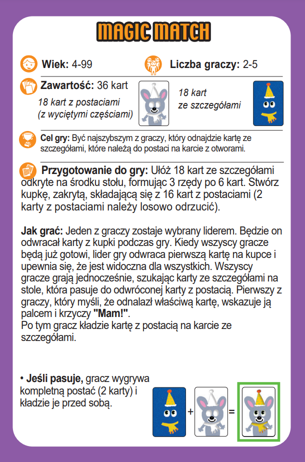 Magic Match to gra karciana dla dzieci od 4. roku życia polegająca na jak najszybszym dopasowaniu karty z otworami do drugiej karty, która prezentuje pogubione szczegóły. Lider gry rozkłada na stole wszystkie kolorowe karty z brakującymi rzeczami. Gdy wszyscy pozostali gracze są gotowi, odkrywa pierwszą kartę z przygotowanej wcześniej kupki z kartami, które posiadają otwory, do których trzeba dopasować kartę z brakującymi rzeczami. Wszyscy gracze grają jednocześnie. Gdy gracz uzna, że znalazł właściwą kartę, krzyczy "Mam!". Gdy po złączeniu dwóch kart, zwierzątko jest kompletne, gracz wygrywa rundę!