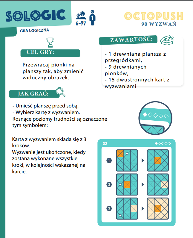 Octopush to kolejna propozycja z serii Sologic od Djeco. Gra polega na przesuwaniu 9 małych piramidek w taki sposób, aby uzyskać ułożenie znajdujące się na karcie wyzwania. 1 z 9 pól na planszy zawsze będzie puste, co umożliwia ruchy. Gra posiada kilka zasad, które trzeba przestrzegać w trakcie rozgrywki i które nieco utrudniają z pozoru łatwe zadanie.