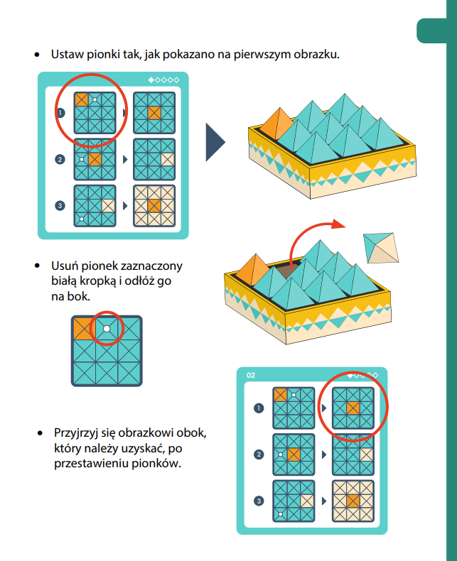Gra uczy logicznego myślenia, rozwija koncentrację i ćwiczy cierpliwość. Wyzwania posiadają rosnące poziomy trudności. Najszybsze rozwiązania zadań znajdują się w instrukcji. Elementy zestawu zostały wykonane z drewna posiadającego certyfikat FSC®.
