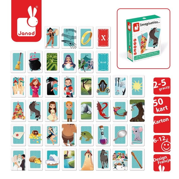 Gra Fantazja dla dzieci i dorosłych ćwiczy pamięć, wyobraźnię, słownictwo oraz uczy rozpoznawać związki przyczynowo-skutkowe. Zestaw zawiera 50 kart, z których 40 przedstawia postać lub element baśniowego świata, m. in. księcia, eliksir, zatokę, skarb, kołyskę, wieżę czy miasteczko na wzgórzu. Na ich podstawie gracze wymyślają jak najdłuższą opowieść, przy czym każda kolejna osoba musi powtarzać ją od początku, uzupełniając o nowy wątek z wylosowanym przez siebie elementem historii. Ponadto w zestawie jest również 5 „jokerów” i 5 kart, oznaczających „koniec opowieści”
