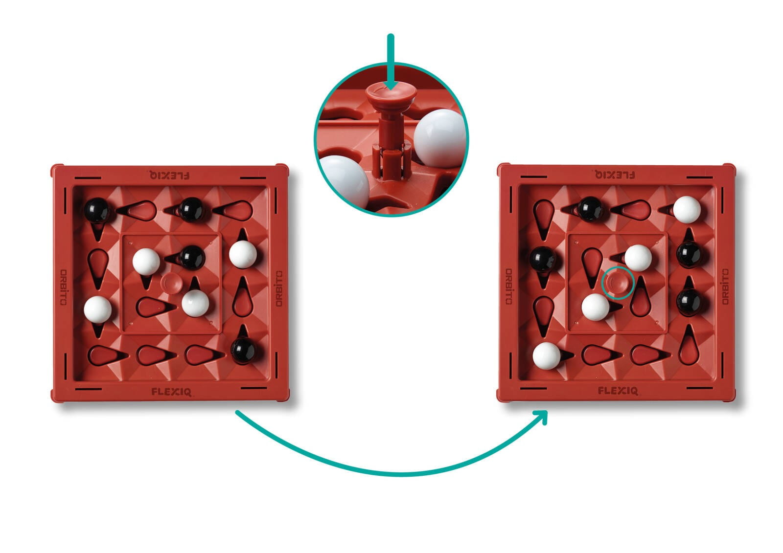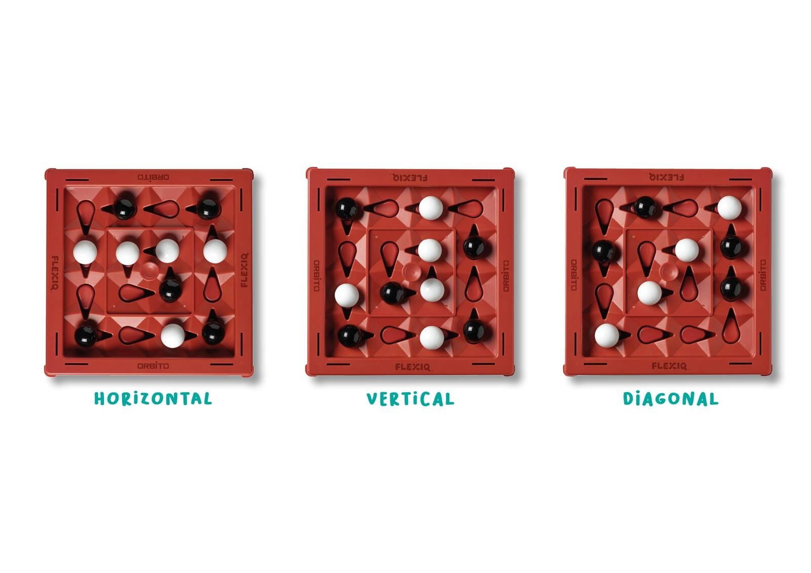 Spróbuj ułożyć 4 kulki w swoim kolorze (białym bądź czarnym) w rzędzie poziomym, pionowym lub ukośnym na opatentowanej, ruchomej planszy Orbito.