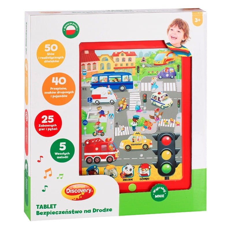 Edukacyjny tablet Dumel, który uczy najmłodszych zasad panujących na drodze. Do wyboru jest kilka trybów zabawy. Można naciskać poszczególne obrazki, aby usłyszeć ich nazwę, realistyczny dźwięk lub wybrać tryb GRA, aby usłyszeć pytanie, na które należy odpowiedzieć poprzez naciśnięcie odpowiedniego obrazka. W trybie MELODIE dziecko może posłuchać wesołych melodii.