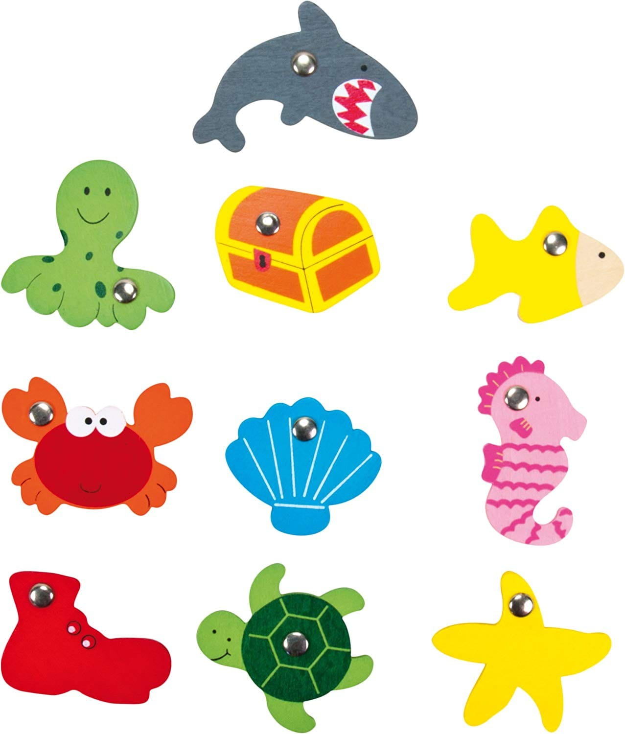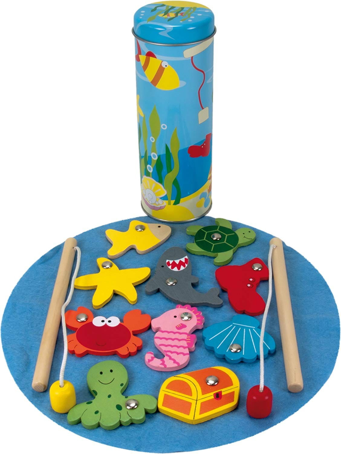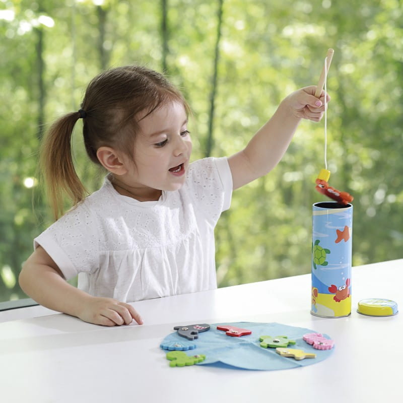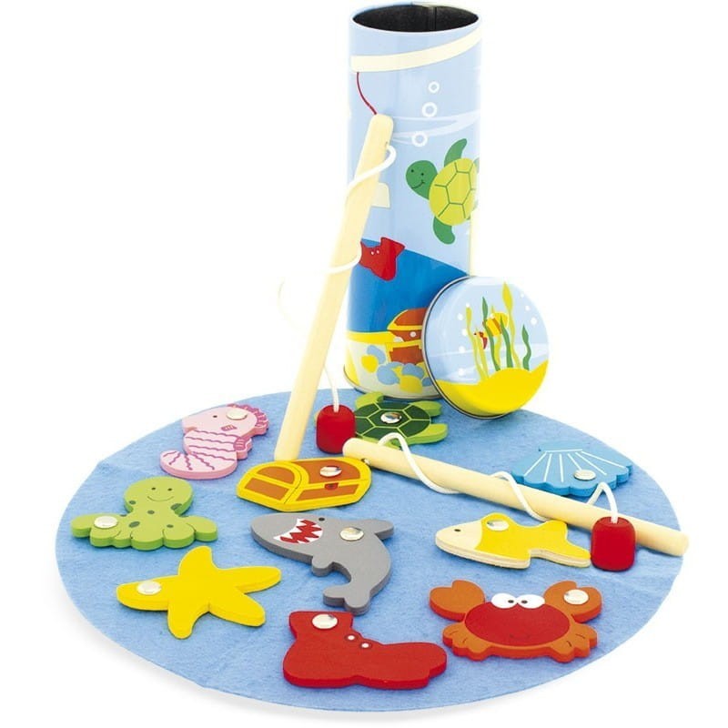 Gra zręcznościowa łowienie rybek francuskiej marki Ulysse, ćwiczy koordynację ruchową oraz cierpliwość, pomaga również w nauce kolorów. Zestaw składa się z metalowego pudełka w kształcie tuby oraz 10 drewnianych elementów: rekina, kraba, złotej rybki, rozgwiazdy, muszli św Jakuba, ośmiornicy, konika morskiego, skrzyni ze skarbami, zatopionego buta oraz żółwia. Dwie drewniane wędki zakończone małym magnesem zapewnią świetną zabawę nie tylko dzieciom ale też rodzicom. Żywa kolorystyka oraz elementy zrobione z humorem to doskonała zabawa i okazja do rozmowy z dzieckiem na temat troski o środowisko.