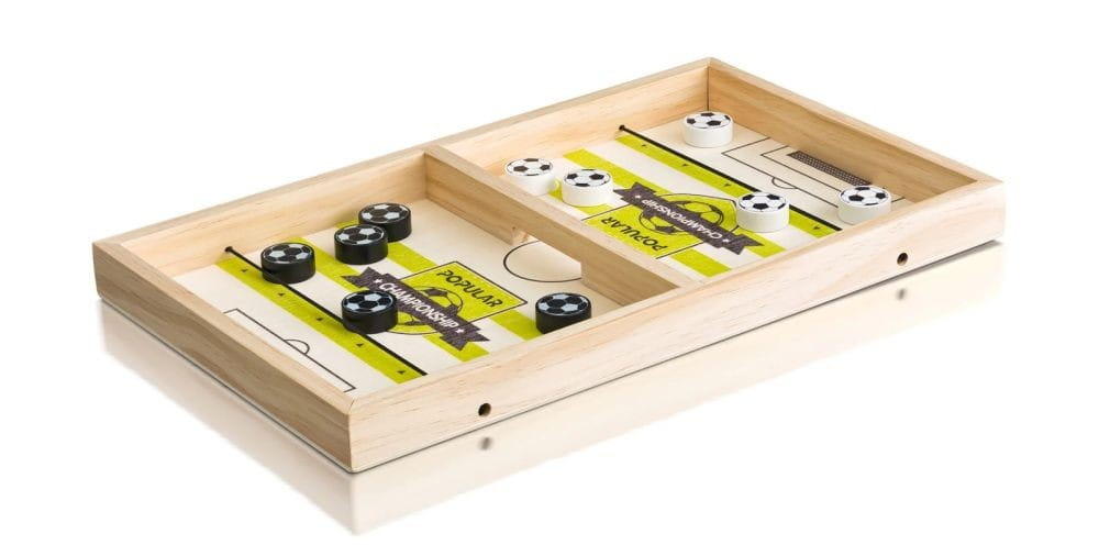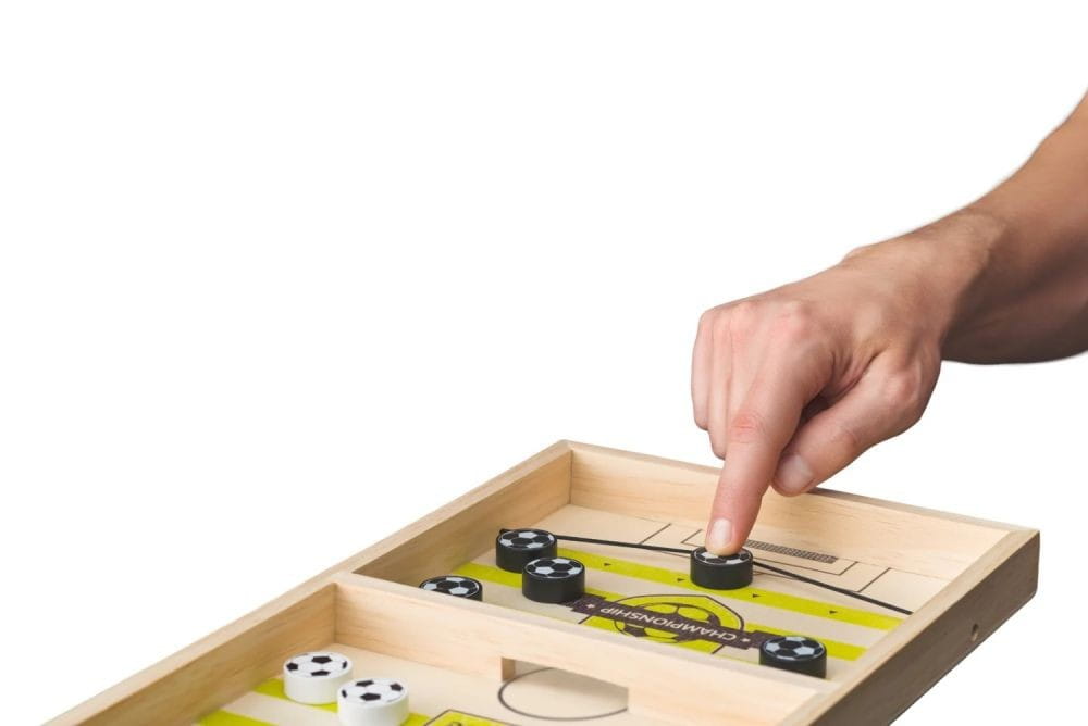 Gra zręcznościowa Sling Puck Game stołowy football to ciekawa propozycja nie tylko dla fanów piłki nożnej. Tutaj liczy się zarówno zręczność, szybkość jak i refleks. Gra składa się z drewnianej planszy oraz krążków. Plansza podzielona została na dwa pola rozdzielone poprzeczką, w której znajduje się otwór. Zawodnicy stają na przeciwko siebie przy planszy. Każdy otrzymuje po pięć krążków, które rozkłada dowolnie na swojej stronie planszy. Należy wystrzelić swoje krążki w otwór w poprzeczce i umieścić je na polu przeciwnika. Wystrzeliwanie odbywa się za pomocą gumek rozciągniętych na przeciwległych końcach planszy. Gra toczy się do momentu, gdy jednemu zawodnikowi uda się wystrzelić wszystkie krążki na stronę przeciwnika. Jeżeli krążek po wystrzale wypadnie poza planszę, gracz umieszcza go na swoim polu.