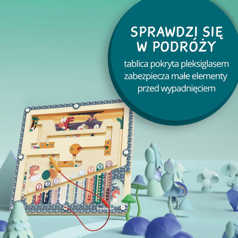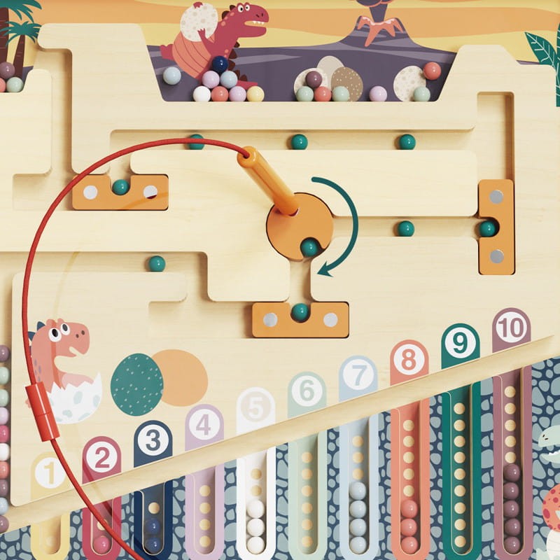 Za pomocą specjalnego, magnetycznego ołówka, dzieci przenoszą kolorowe jaja dinozaurów przez labirynt, aż do gniazd. Dzieci uczą się nie tylko liczyć ale także ćwiczą koordynację, skupienie i logiczne myślenie, omijając przeszkody w labiryncie.