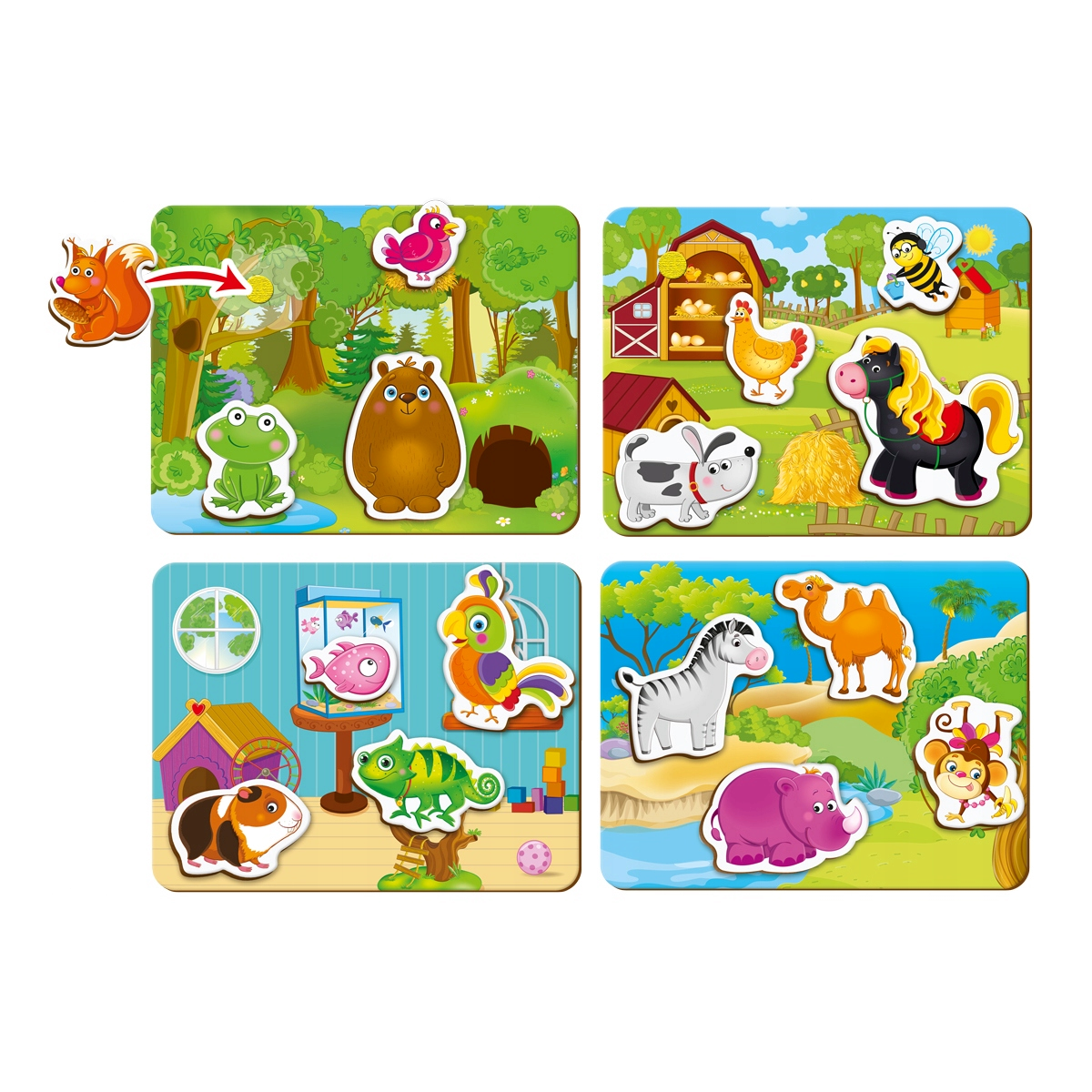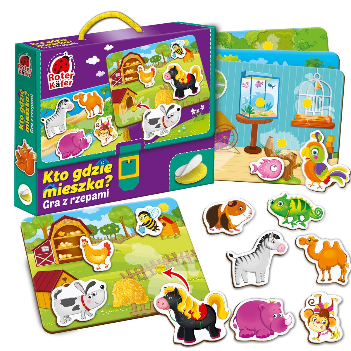 Pomóż zwierzątkom znaleźć swoje miejsce zamieszkania i i przyczep je w odpowiednim miejscu na planszach. Układanka z rzepami to świetna nauka poprzez zabawę! Kto gdzie mieszka?, czyli Gra z rzepami to zabawa edukacyjna, w której najmłodsi poznają zwierzęta i ich miejsca zamieszkania.