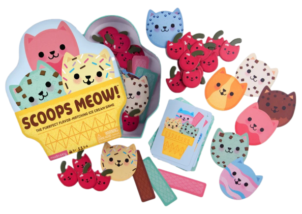 Zawartość: 24 karty ze skomponowanymi deserami lodowymi, 32 kolorowe żetony-kulki lodów w kształcie uroczych kocich pyszczków, 12 podłużnych żetonów-wafelków oraz 30 żetonów-wisienek (też z kocimi mordkami)