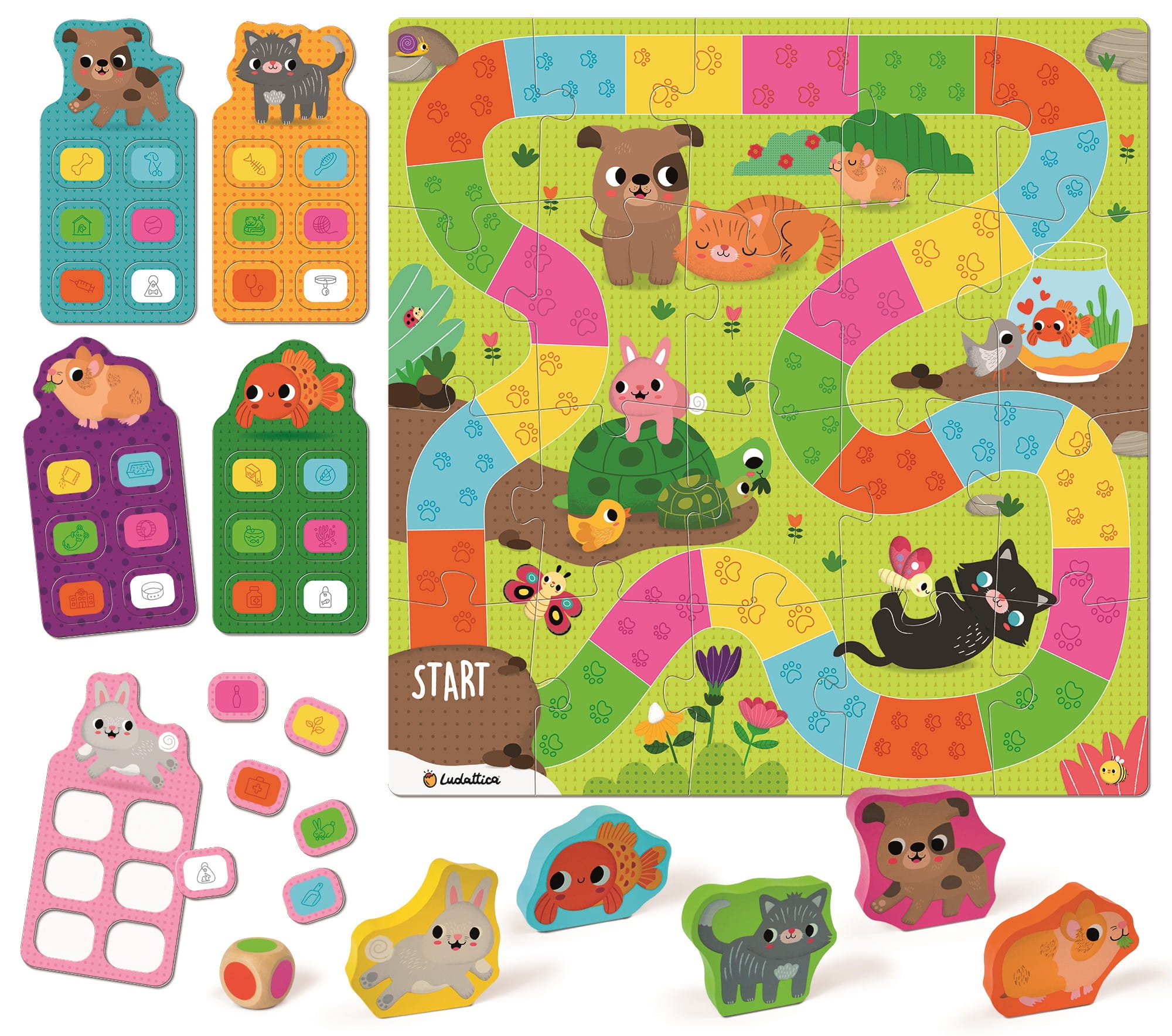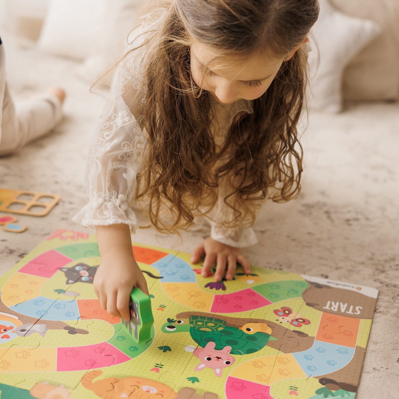 Duże puzzle stają się po ułożeniu planszą do gry. Drewniane pionki w kształcie zwierząt podążają trasą z kolorowymi polami.