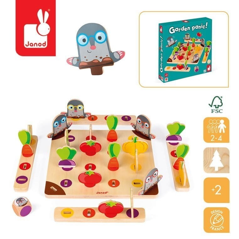 Edukacyjna gra planszowa Wyścig Strzeż się Kreta firmy Janod to wspaniała zabawa dla całej rodziny. Zadanie polega na zebraniu plonów do swojego koszyka (rzut kostką wskazuje na konkretne warzywo lub kreta), ale przeszkadzać w pracy może kret. Gra Wyścig posiada ładną grafikę, wysokiej jakości elementy zestawu: drewnianą planszę, figurki warzyw, figurki kreta oraz drewnianą kostkę do gry. Zasady są proste i przyjemne, bez trudu poradzą sobie już 3 latki. Rzucanie kostka jest dużą atrakcja i dobrym wstępem do gier o wyższym poziomie. Gra Janod ćwiczy zdolności obserwacyjne, cierpliwość, rozpoznawanie kolorów.