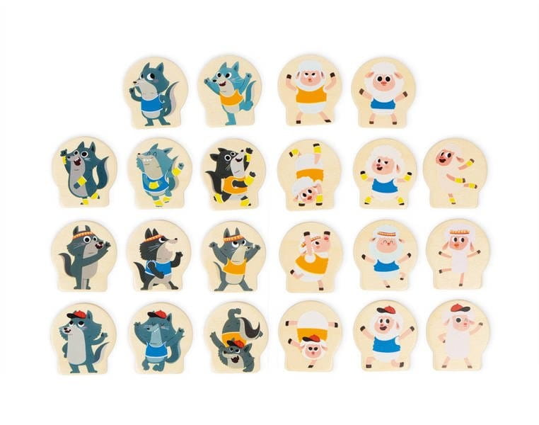 W skład zestawu wchodzi gruba plansza z solidnego kartonu z grafiką łąki, sędziującego łosia i miejscami na ułożenie akrobatycznej piramidy, a także 11 drewnianych żetonów z owieczkami i 11 drewnianych żetonów z wilkami.