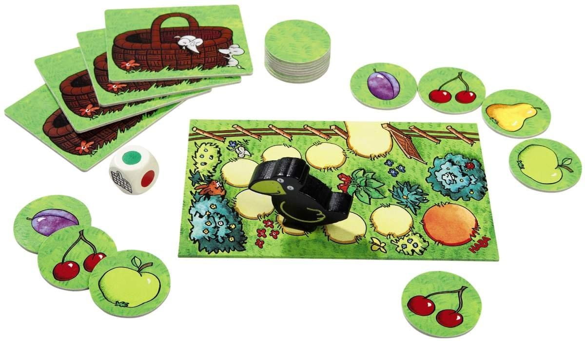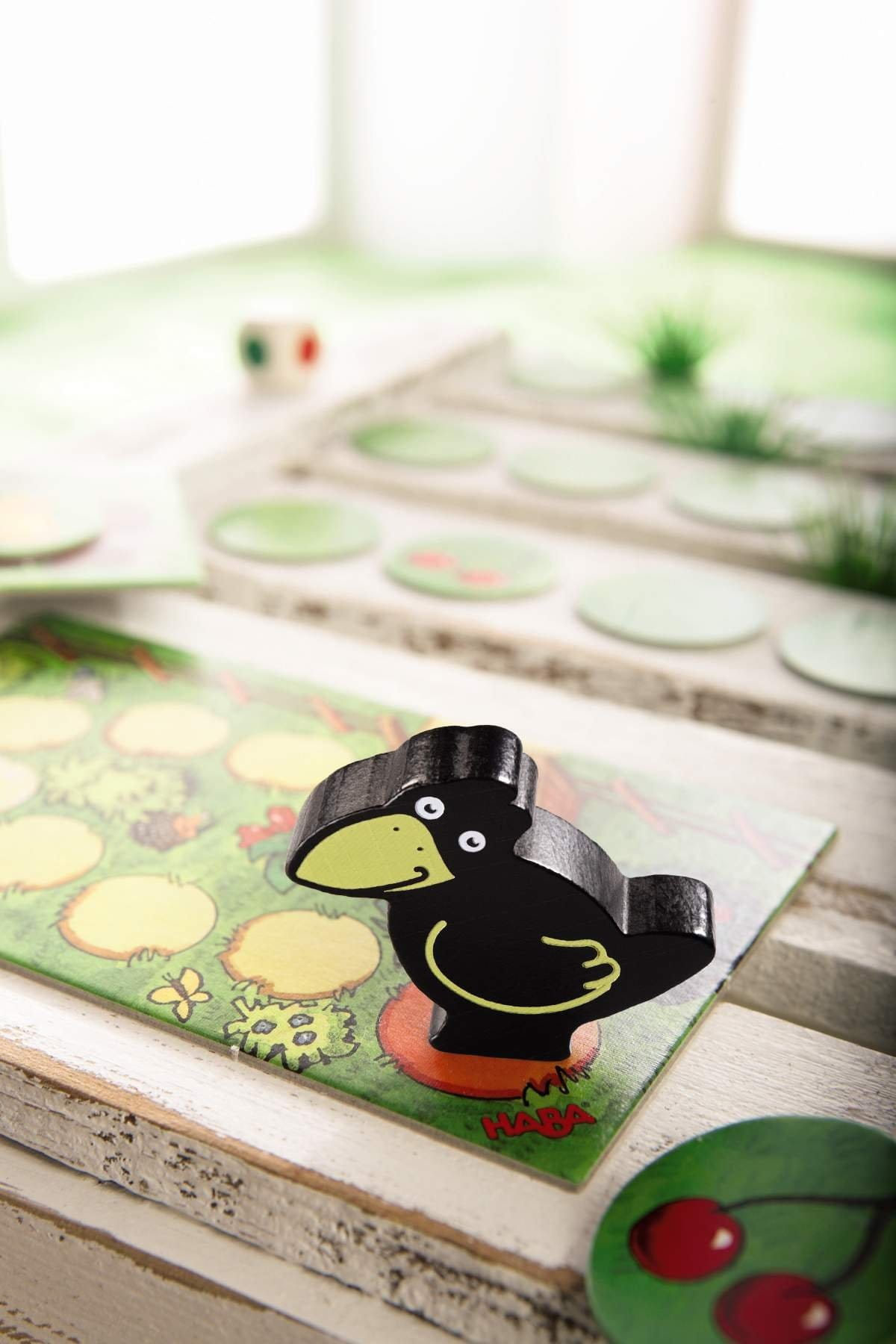Gra pamięciowa "W Ogrodzie" Obstgarten Haba już dla 3-latków i starszych dzieci. Zabawa polega na odnajdywaniu owoców, które kolorem odpowiada kolorowi wyrzuconemu na kostce do gry. Jeżeli rzucając kostką wypadnie kruk, figura kruka przesunie się o jedno miejsce na planszy. Celem gry jest jak najszybsze zebranie wszystkich owoców, uniemożliwiając zjedzenia ich krukowi.