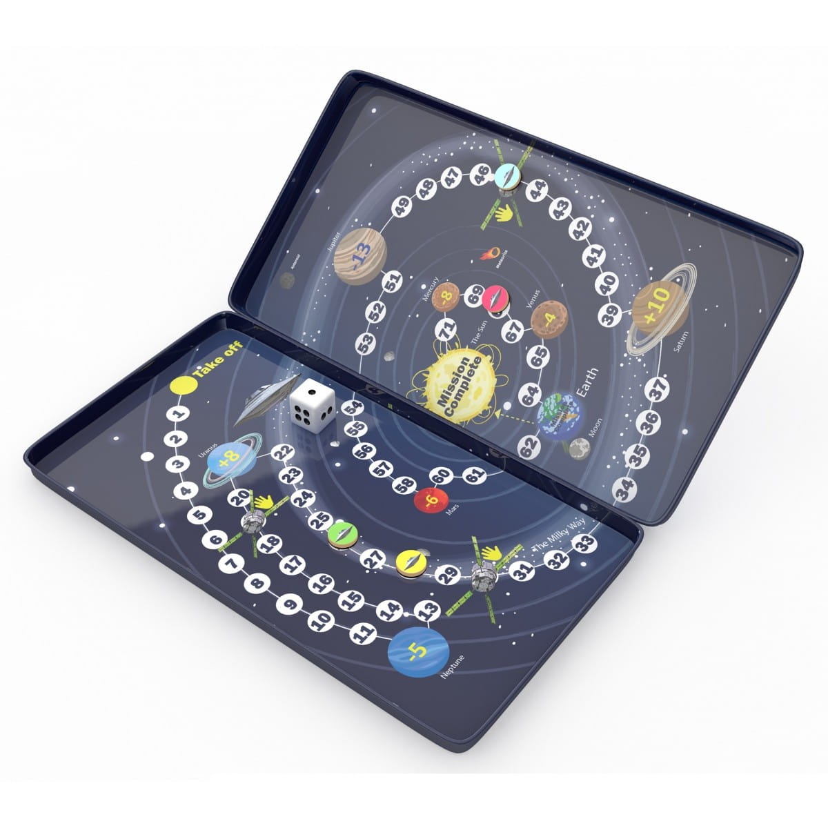 Gra magnetyczna podróżna Space Mission to planszówka z kostką, która świetnie sprawdzi się poza domem. Magnetyczne elementy nie pogubią się, w każdej chwili można wrócić do zabawy. Całość zapakowana jest w kompaktowe, metalowe pudełko.