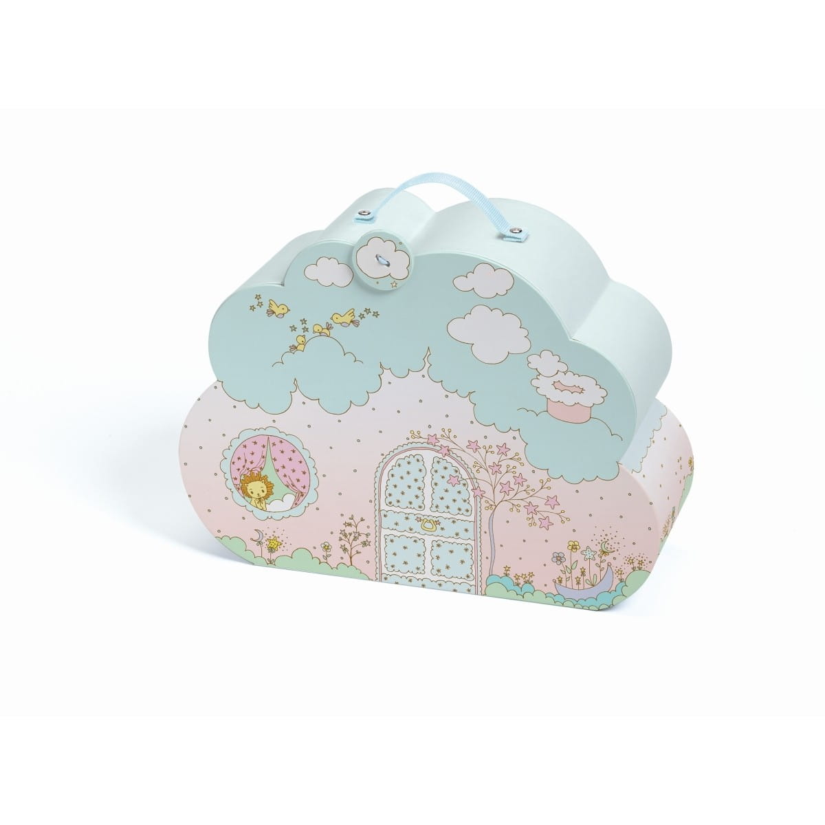 Niezwykła walizeczka Djeco mieści w sobie domek dla lalek. Przenośny domek w kształcie chmury jest bardzo łatwy do złożenia i zabrania wszędzie ze sobą. Domek otwierany jak walizka oferuje mnóstwo świetnej zabawy, znajdziemy tam kuchnię, pokoje i wnęki, w których można ustawić figurki oraz stół.
