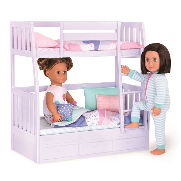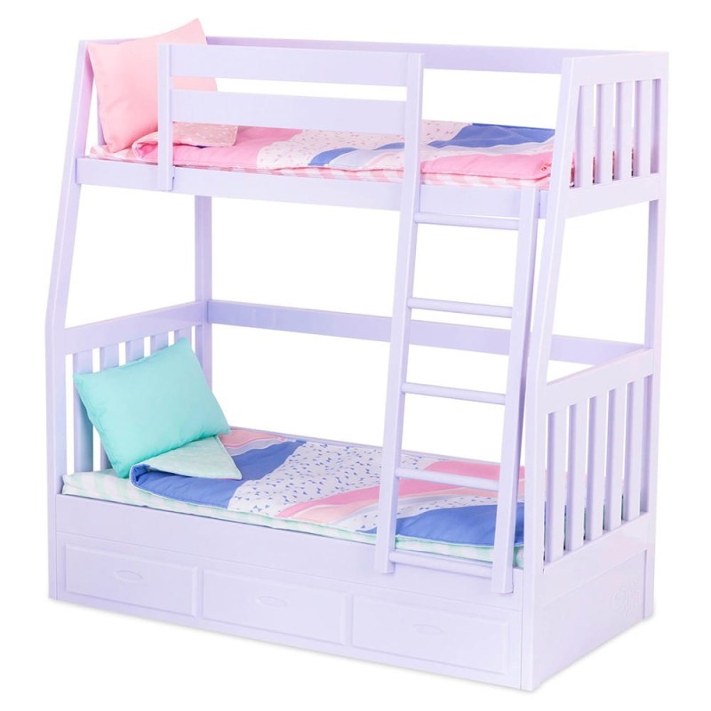 Łóżko piętrowe w kolorze liliowym wraz z pościelą Dream Bunks firmy Our Generation do lalek 46 cm.