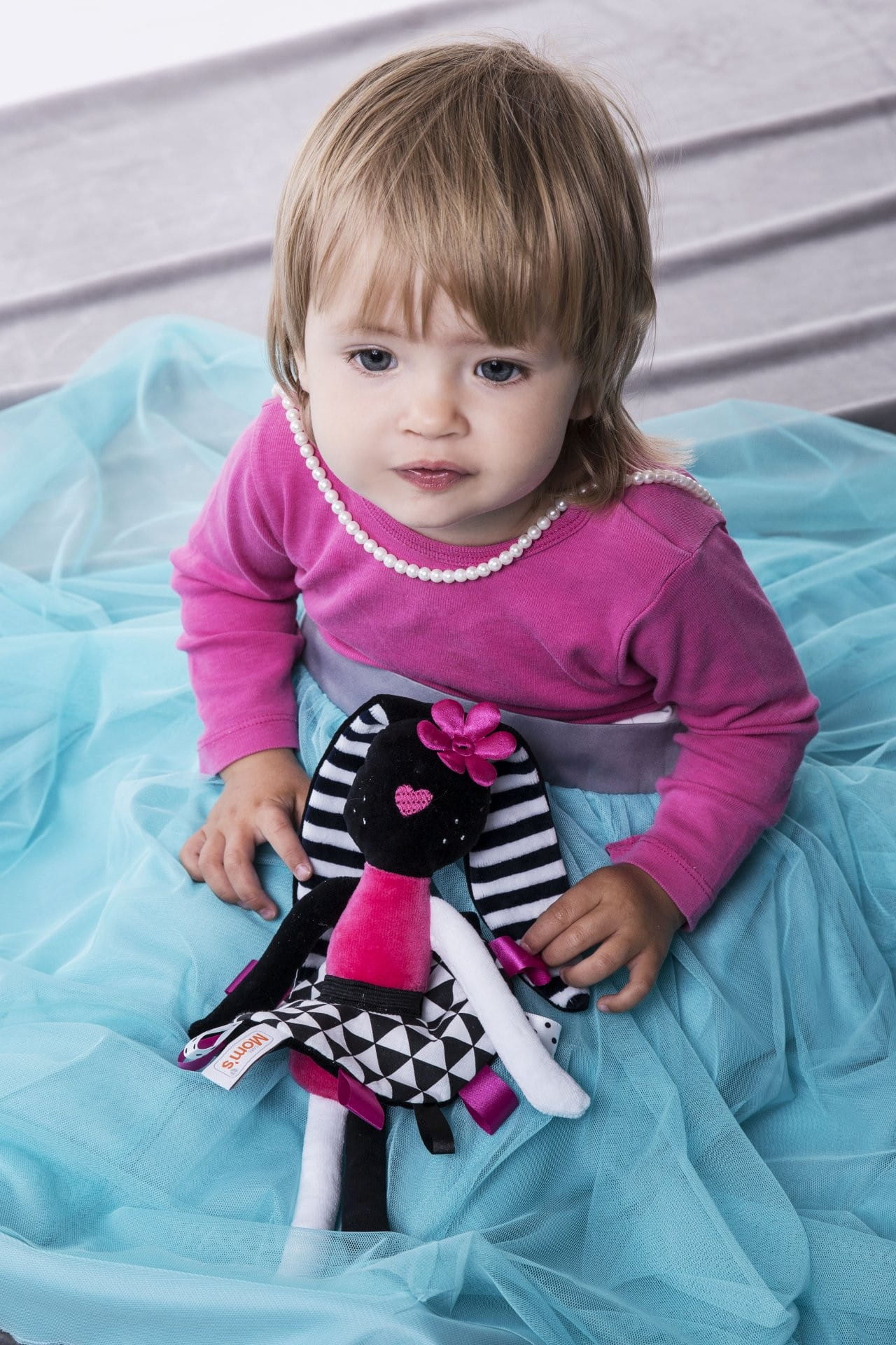 Długie uszy i wystające metki są interesujące dla dziecka, zachęcą do chwytania i pomagają w rozwoju motoryki małej dłoni. Zdejmowana spódniczka, może być założona na rączkę dziecka.