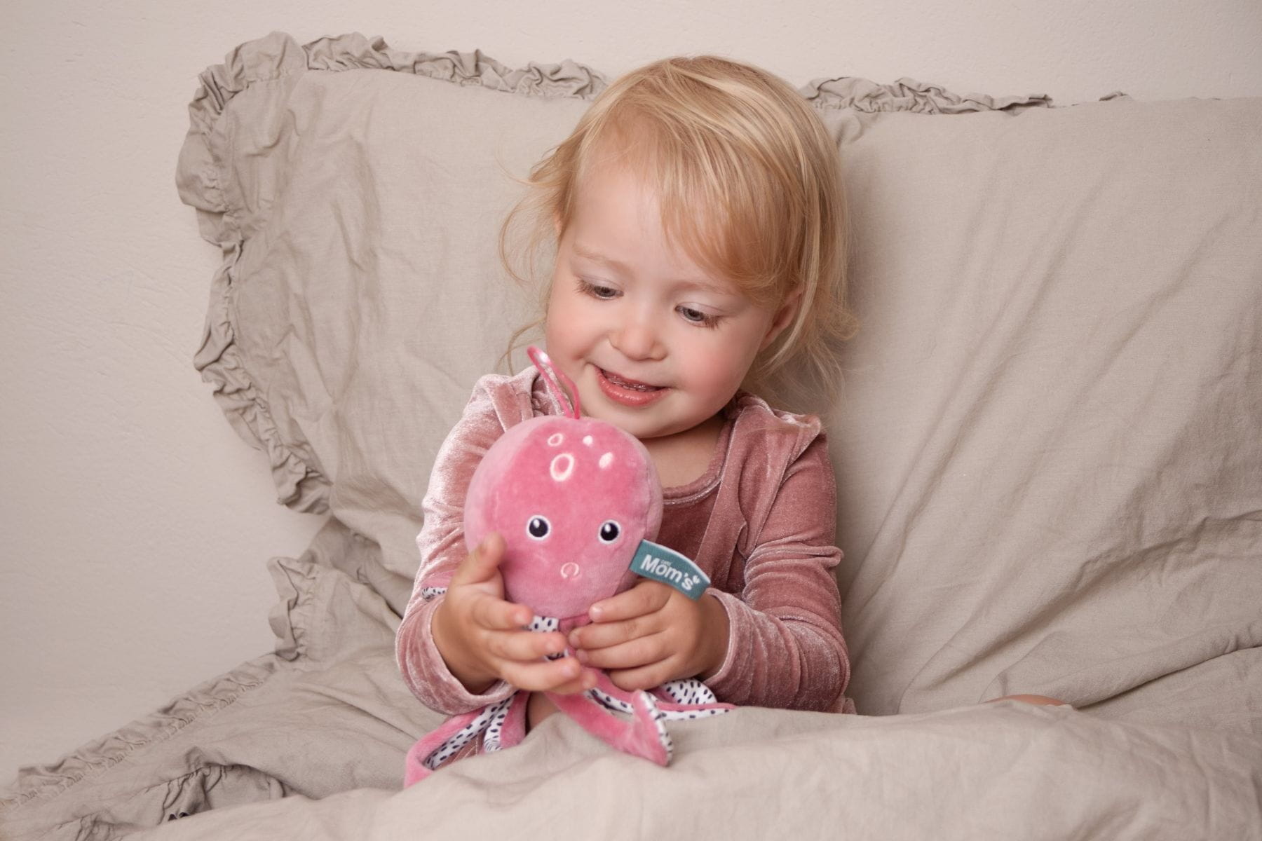 Mięciutka, pastelowa ośmiornica od Mom's care została stworzona z myślą o najmłodszych. Dziecko będąc w brzuchu, chwyta pępowinę. Macki ośmiornicy mają mu ją przypominać. Kiedy potrzesz ośmiornicę o swoją skórę i położysz ją obok swojego maleństwa wzbudzisz w nim poczucie bezpieczeństwa i komfortu. Ośmiornica przypomina także maluszkowi o ostatnich 9 miesiącach spędzonych w brzuchu mamy.