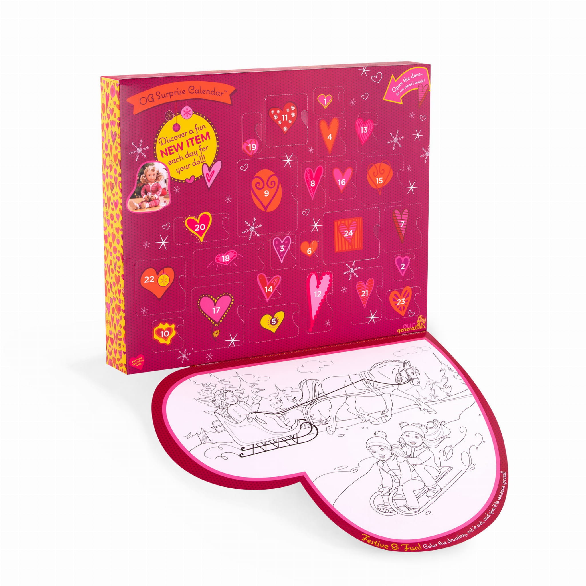 Dziewczynka będzie zachwycona otwierając poszczególne okienka kalendarza adwentowego i ubierając swoją lalkę w wyjątkowe akcesoria. Dodatkowo na wewnętrznej stronie klapy opakowania znajduje się świąteczny obrazek do wycięcia i pokolorowania.