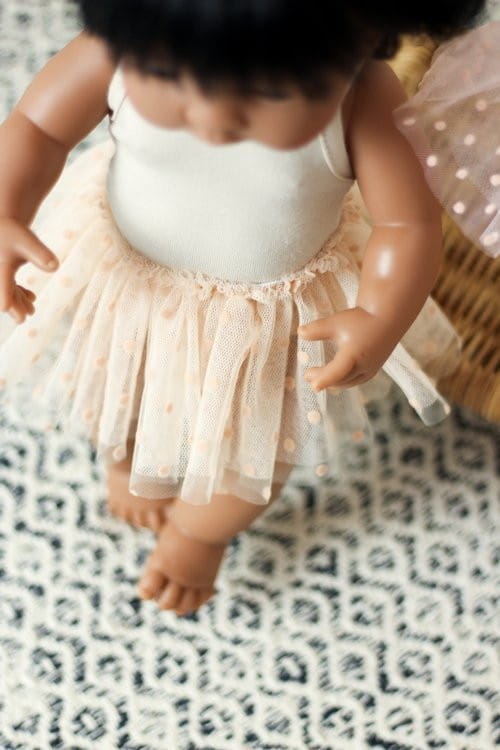 Spódniczka tutu oraz beżowe body dla lalki Miniland o wysokości 38 cm. Spódnica uszyta jest z dwóch warstw tiulu: gładkiego i w delikatne kropki. Strój wykonany z materiałów w kolorze beżowym został starannie, ręcznie uszyty w Polsce.