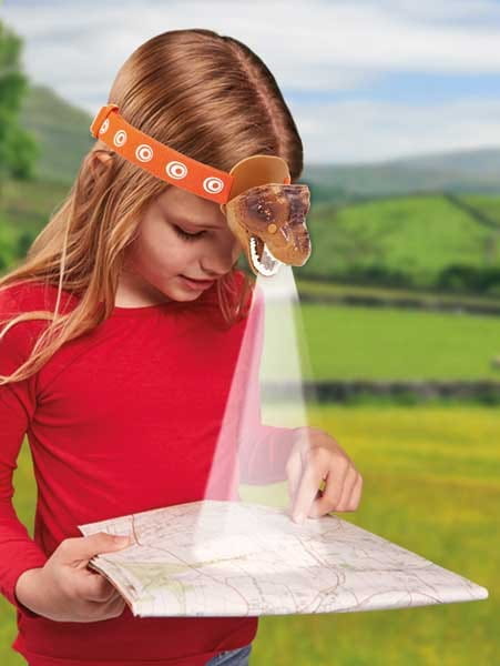 Latarka czołowa w kształcie T-Rexa wydaje dźwięk i światło – RYCZY jak dinozaur! Załóż latarkę na czoło i wskocz pod kołdrę, albo do namiotu, załóż podczas spaceru lub wycieczki rowerowej. Niezastąpiona w podróży i na wakacjach.