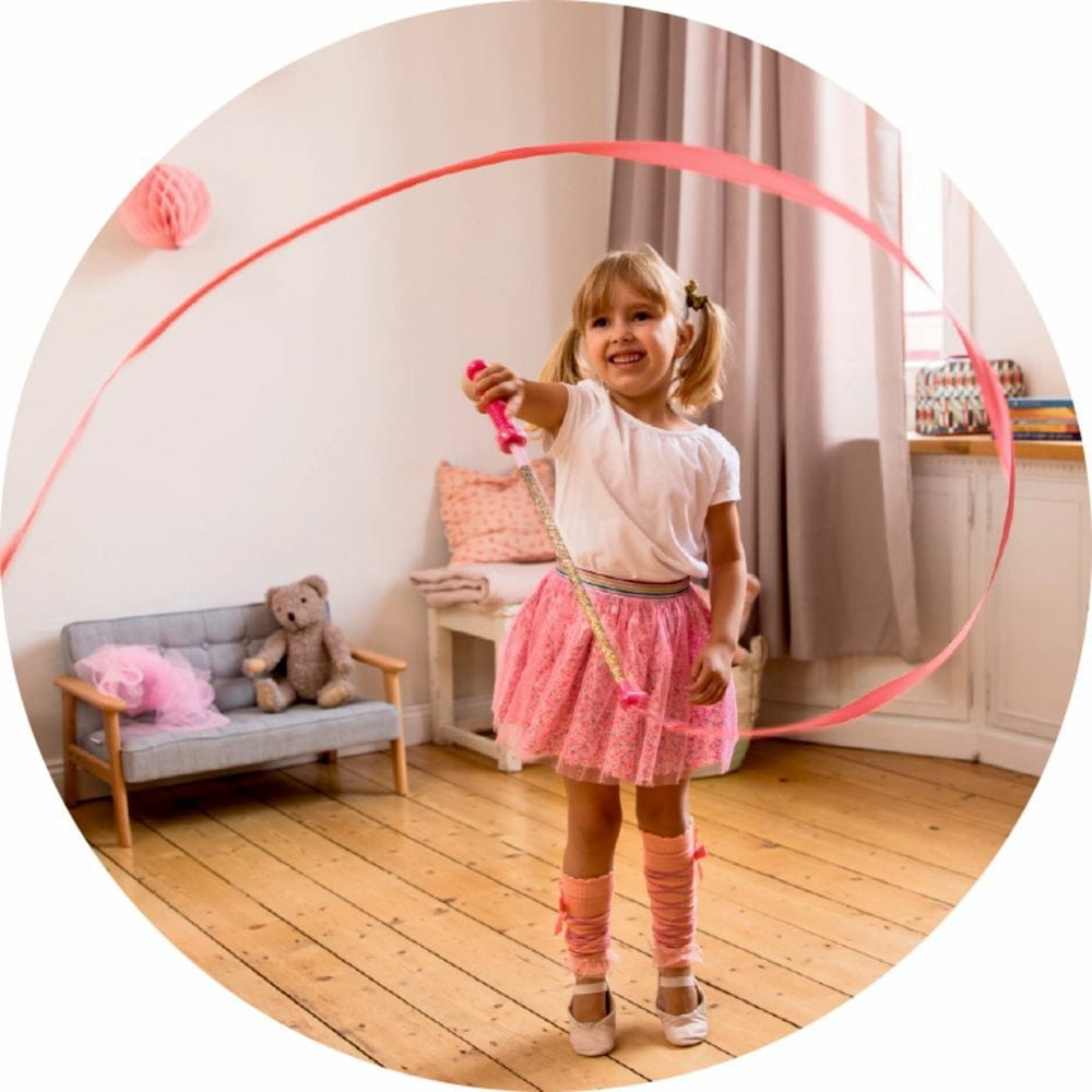 Różowa wstążka gimnastyczna do ćwiczeń, tańca i zabaw. Wstążka pięknie wiruje i unosi się w powietrzu podczas podskoków i obrotów. Zachęca dzieci do aktywności fizycznej. Idealnie sprawdzi się na zajęciach z tańca, rytmiki, gimnastyki artystycznej, czy zabaw w domu. Falująca wstążka będzie też świetnym rekwizytem do swobodnych zabaw, podskoków, piruetów i wygłupów.
