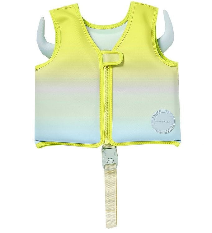 Kamizelka kąpielowa SunnyLife w kolorze żółto-błękitnym z żółtymi lamówkami, z tyłu aplikacja rogów, a także nadruk dwojga oczu i ostrych zębów.