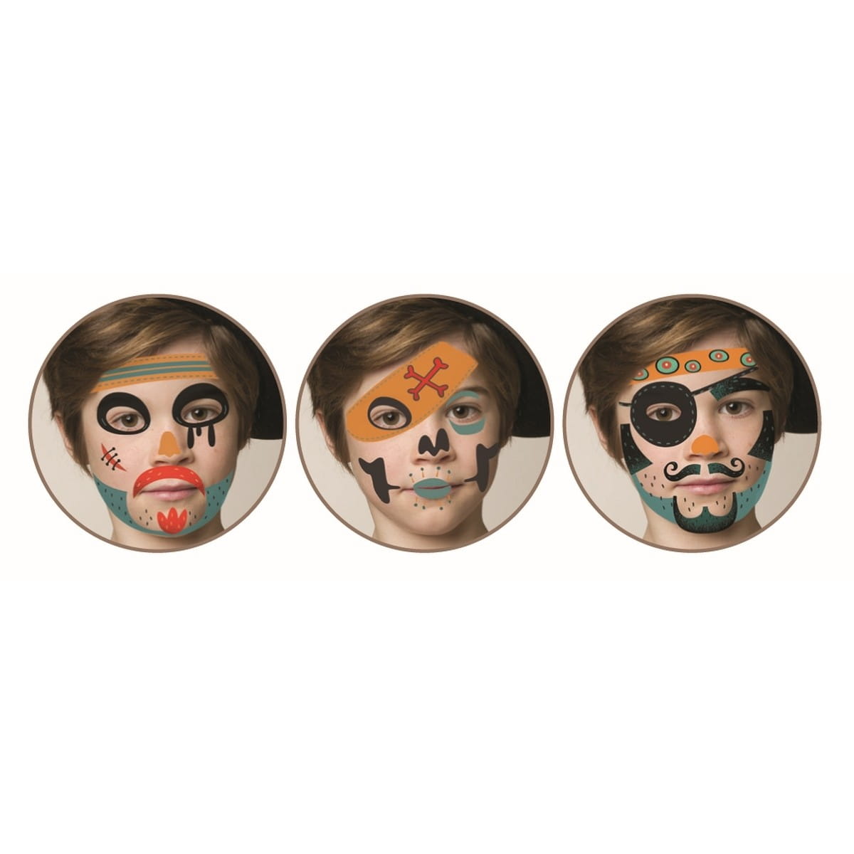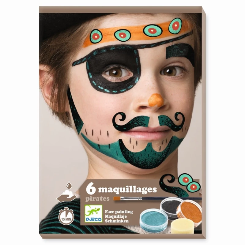 Farby do malowania dziecięcej buzi Djeco liczą 3 kolory, pędzelek, 2 gąbeczki do precyzyjnego nanoszenia wzoru oraz arkusze naklejek do twarzy. Farby do dekorowania dziecięcej twarzy są bezpieczne, łatwo zmywalne, ładnie się rozprowadzają za pomocą załączonej gąbeczki lub pędzelka. Ten zestaw pozwoli na charakteryzację w stylu pirackim.