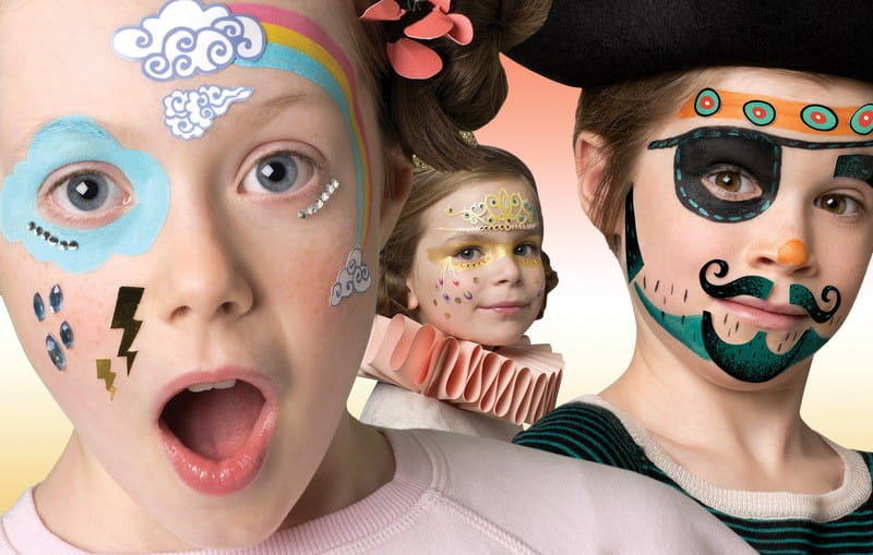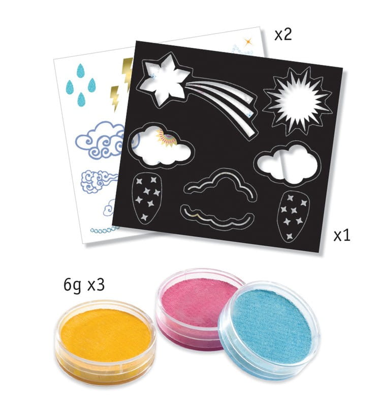Farby do malowania dziecięcej buzi Djeco liczą 3 wyraźne, pastelowe kolory, pędzelek do precyzyjnego nanoszenia wzoru, szablony do odmalowywania wzorów na buzi, oraz arkusze naklejek do twarzy. Farby do dekorowania dziecięcej twarzy są bezpieczne, łatwo zmywalne, ładnie się rozprowadzają za pomocą załączonej gąbeczki lub pędzelka. Ten zestaw pomoże w wykonaniu ciekawej charakteryzacji.