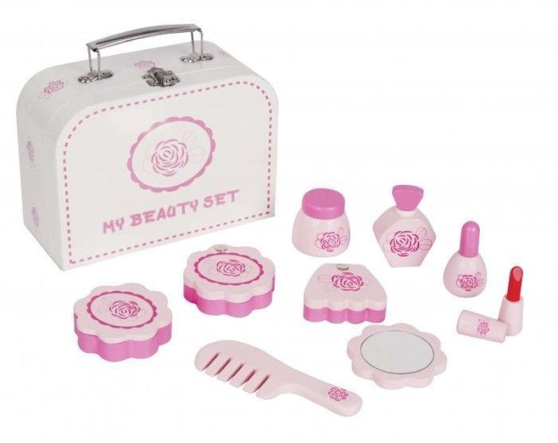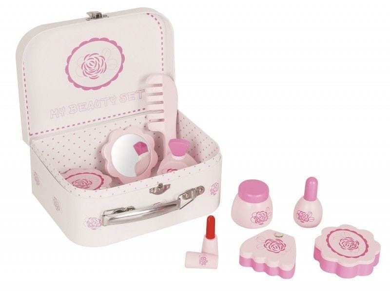 Drewniany zestaw pełen kosmetyków uszczęśliwi dziewczynkę, która lubi naśladować mamę podczas pielęgnacji. W kuferku znajdziemy wszystko co niezbędne do zabawy w salon piękności. Z własnym zestawem przyborów kosmetycznych dziewczynki mogą próbować malować siebie tak jak robi to mama, zadbać o lalki, albo zaprosić przyjaciółki. Przenośna kosmetyczka w kształcie walizeczki ma duży uchwyt i można ją zabierać ze sobą.
