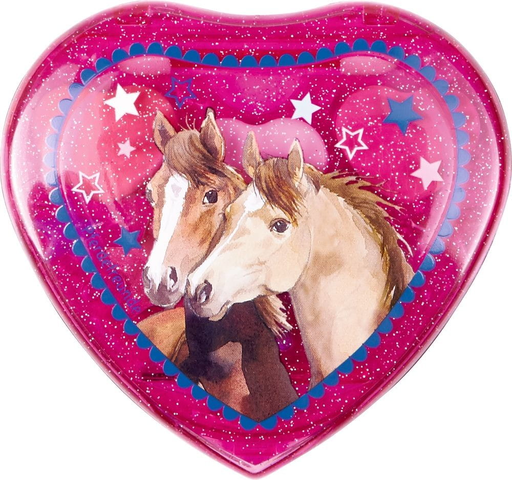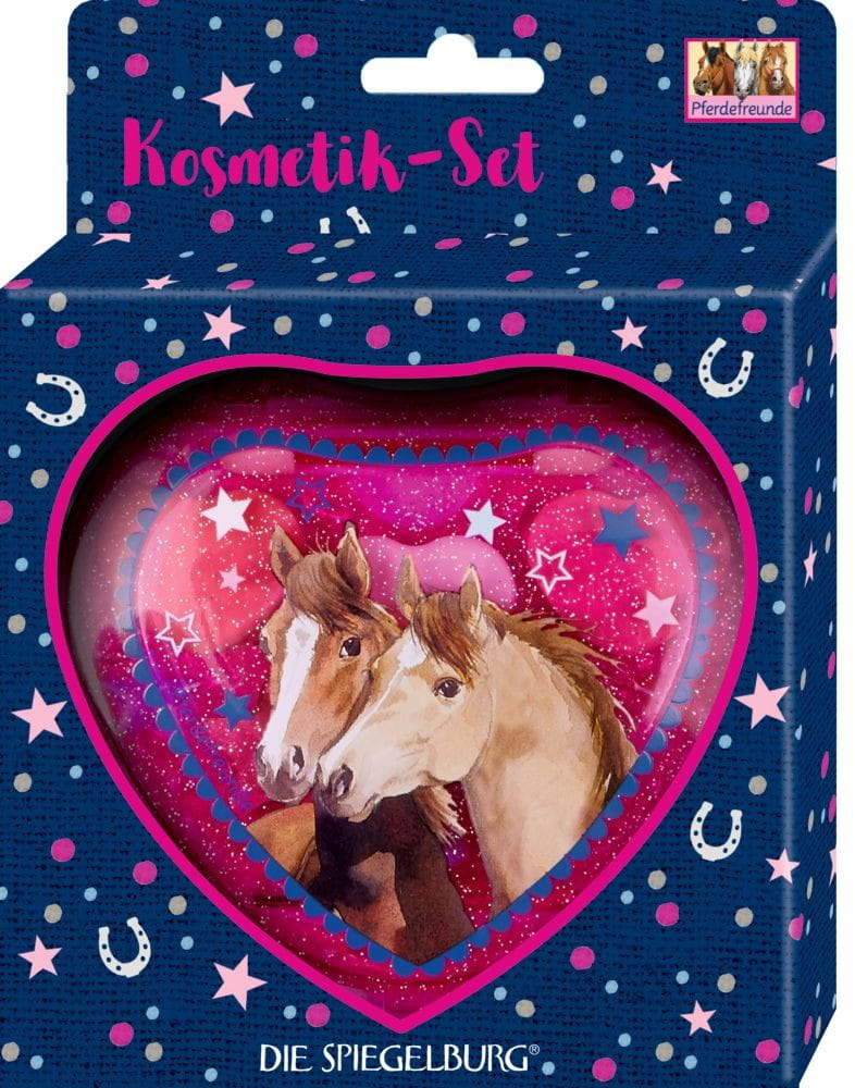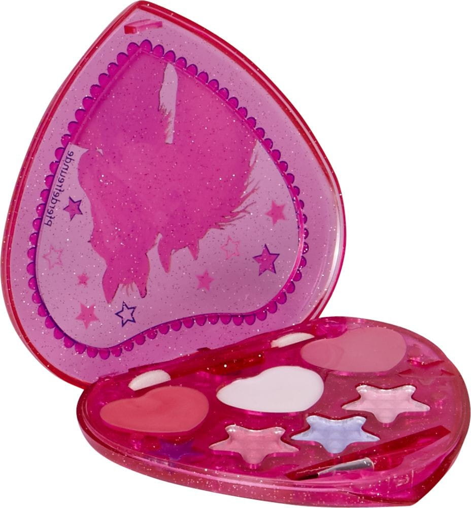 Zestaw do makijażu zawiera cień do powiek, błyszczyk i balsam do ust o zapachu wanilii oraz aplikator do nakładania cieni i błyszczyku. Różowe pudełko w kształcie serduszka zawiera bezpieczne dla dzieci kosmetyki do malowania. Zestaw kosmetyczny Pferdefreunde Koń mój przyjaciel to piękna, poręczna paletka z delikatnymi kolorami.