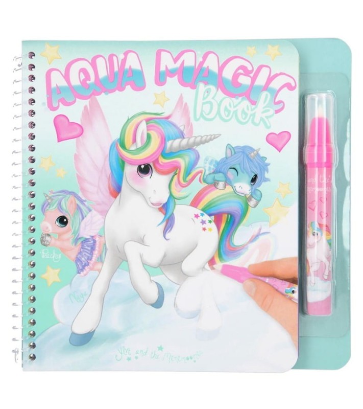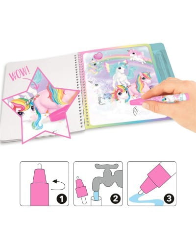 Wodna kolorowanka z jednorożcami to magiczne malowanie przy pomocy wody. Książeczka ze specjalnym flamastrem na wodę, który napełnia się wodą i można używac wielokrotnie. Po pomalowaniu rysunków markerem wodnym, pojawiają się kolorowe obrazki. Gdy strona wyschnie, kolor znika i tylko kontury są widoczne. Kolorowanka z markerem wodnym Aqua Magic Book Jednorożec Ylvi wysycha po 15 minutach i można malować od nowa.